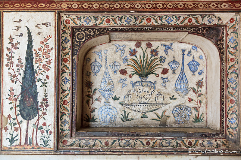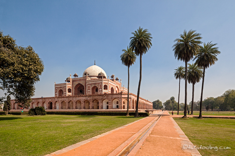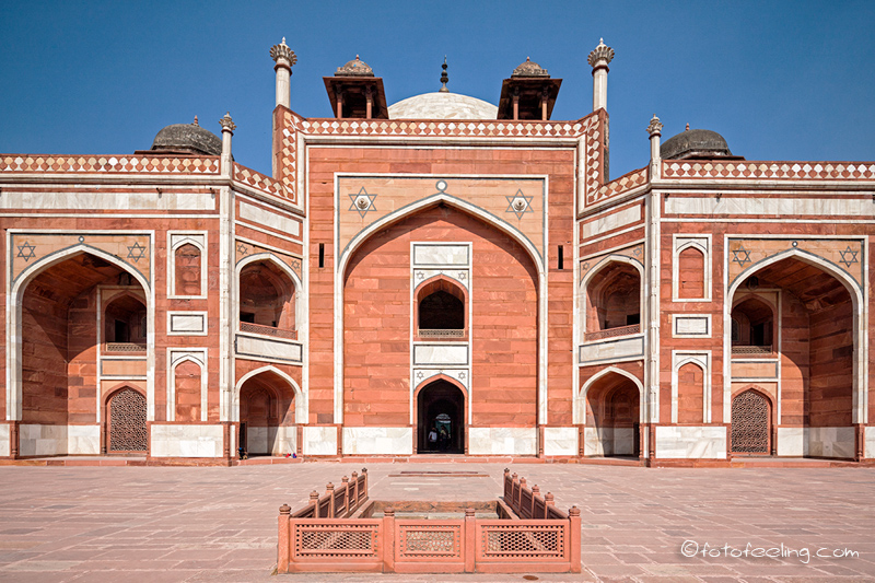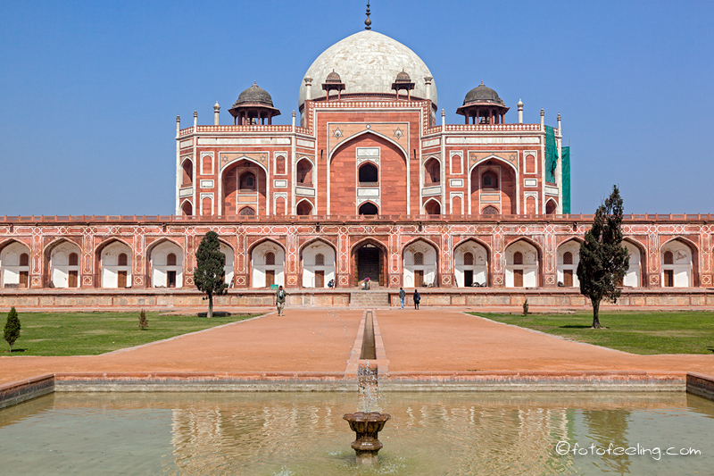 Zuerst fuhren wir zum Humayun-Mausoleum, das 1993 von der UNESCO zur Weltkulturerbestätte erklärt wurde. Diese traumhaft schöne Oase ist die Grabstätte von Nasir ud-din Muhammad Humayun, dem zweiten Herrscher des Großmogulreiches von Indien. Es wurde im Auftrag seiner Frau 1565, 9 Jahre nach seinem Tod, fertiggestellt. Das Mausoleum mit seiner 43 m hohen Marmorkuppel gilt als Prototyp der Mogul-Grabmäler und als schönstes Bauwerk der frühen Mogul-Epoche. Die ohne rahmende Minarette errichtete Grabstätte befindet sich inmitten einer weiträumigen, geometrisch angelegten und von vier Wasserläufen durchzogenen parkähnlichen Gartenanlage. Mit Wasser gefüllte Rinnen laufen symmetrisch auf das Gebäude zu, Springbrunnen plätschern, Palmen wiegen sich im Wind. Ein Ort voller Harmonie in dieser lebenssprudelnden Großstadt. Fast schon ehrfürchtig und staunend durchwanderten wir diesen faszinierenden Bau. Immer wieder hielten wir für Bilder an und konnten uns kaum davon losreißen, doch unser Reiseführer lotste uns weiter. Es gab an diesem Tag noch einiges zu erkunden.