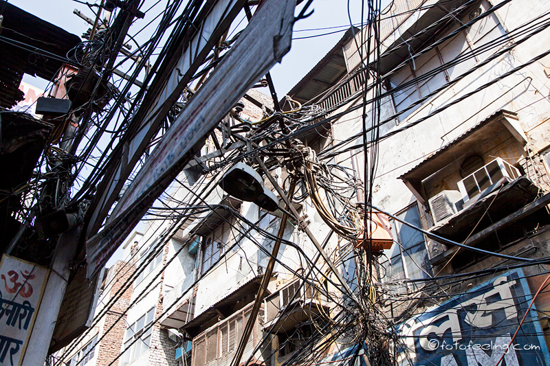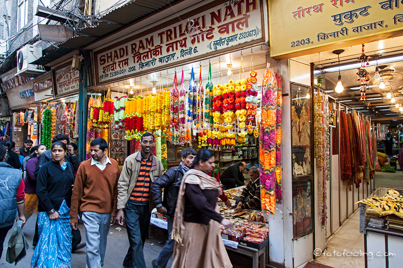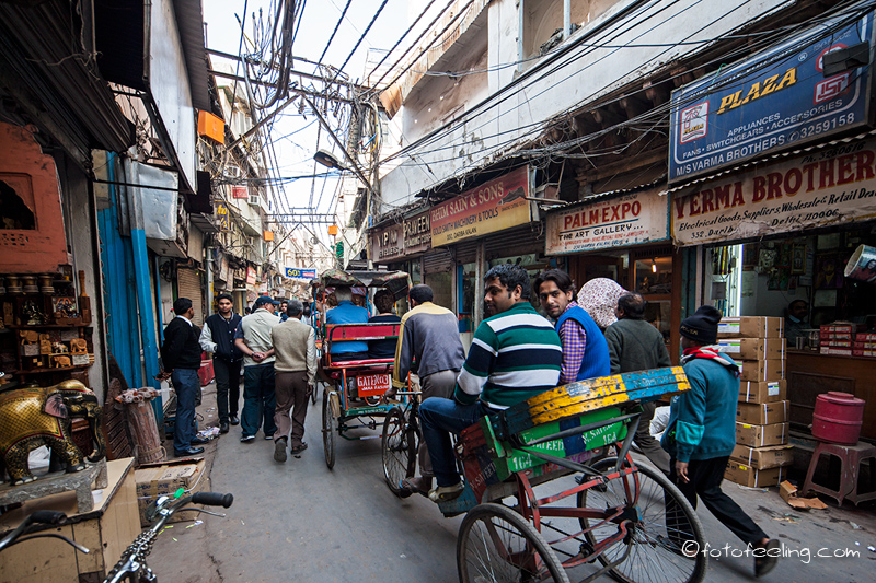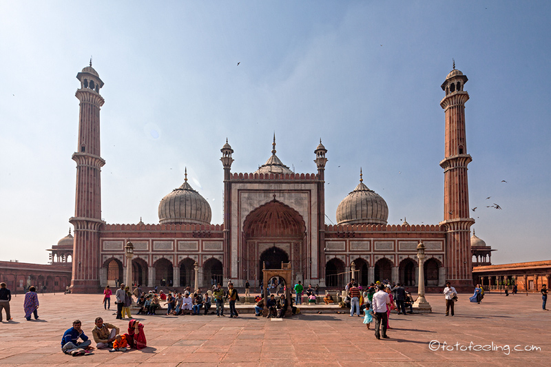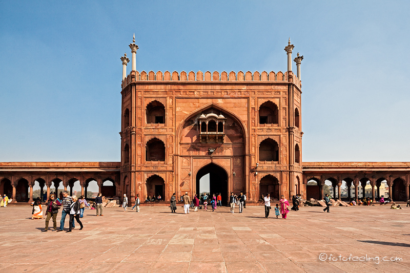 Sie wurde von Shah Jahan, dem fünften und vorletzten Großmogul auf einem kleinen Felsen errichtet und thront somit über den quirligen Basarvierteln Old Delhis, ganz in der Nähe des Roten Forts. Sie besteht aus rotem Sandstein und hat 40 m hohe Minarette auf denen je ein zwölfseitiger, offener Pavillon sitzt. Die Kuppeln, von denen die mittlere die größte ist, bestehen aus weißem Marmor und die Streifen in den Kuppeln aus schwarzem Marmor. Eine breite Treppe führte uns zur Moschee empor. Vor dem gewaltigen Eingangstor mussten wir unsere Schuhe ablegen. Da noch Gebetszeit war, schauten wir uns davor noch etwas um und beobachteten von oben das quirlige Treiben auf den engen Basarstraßen.