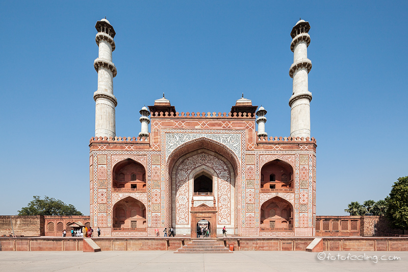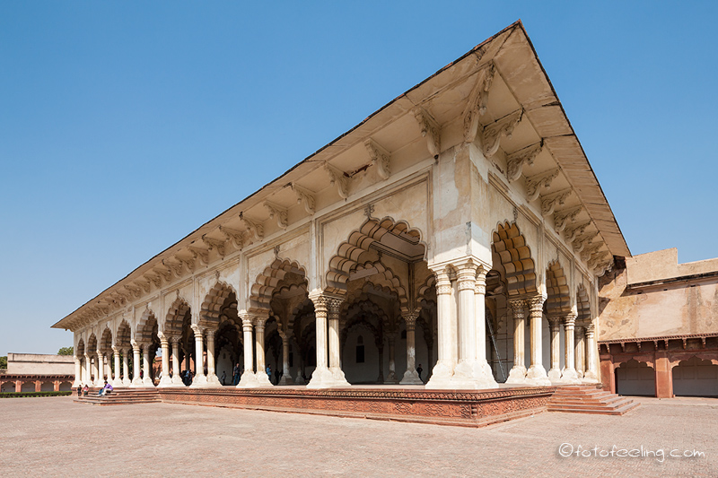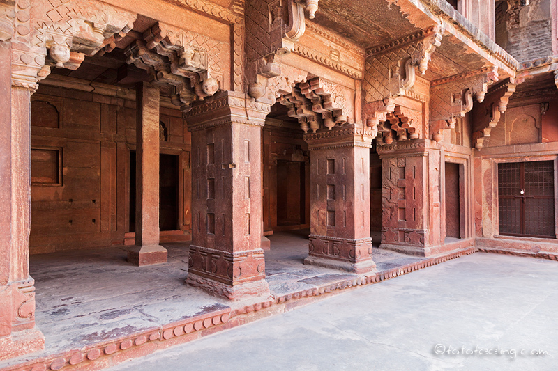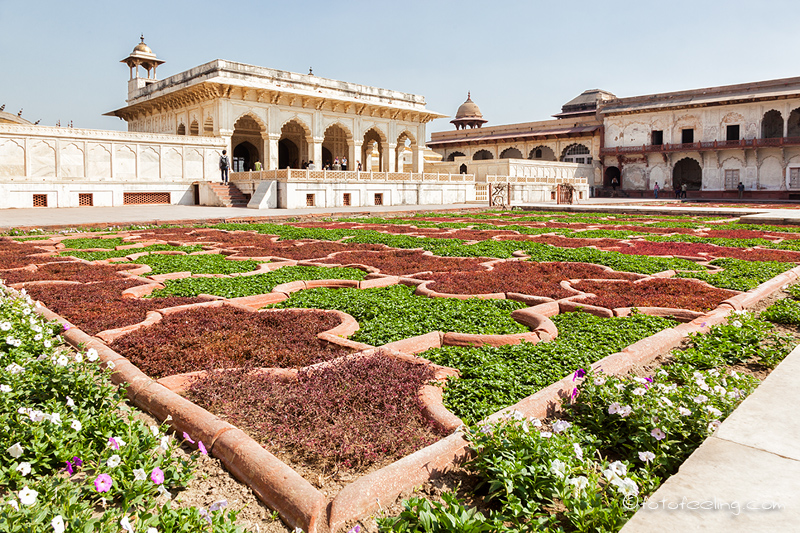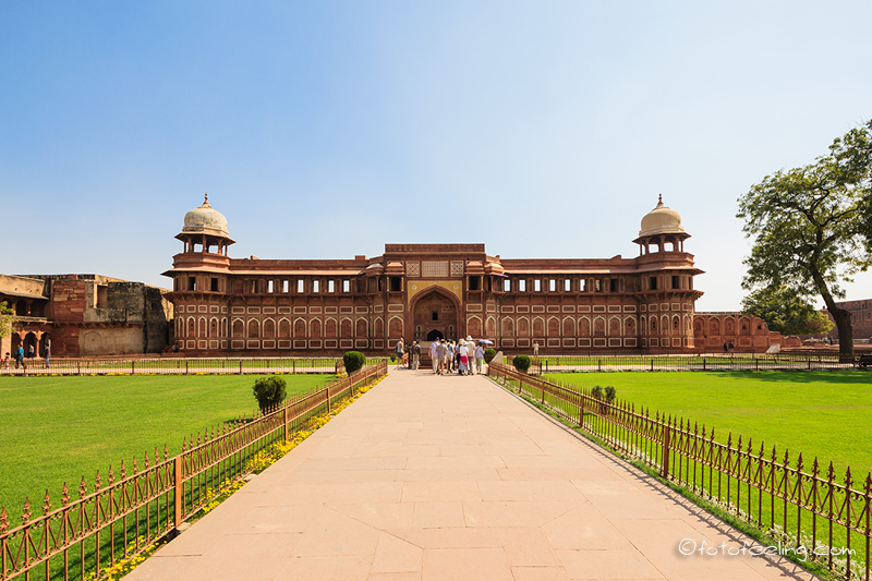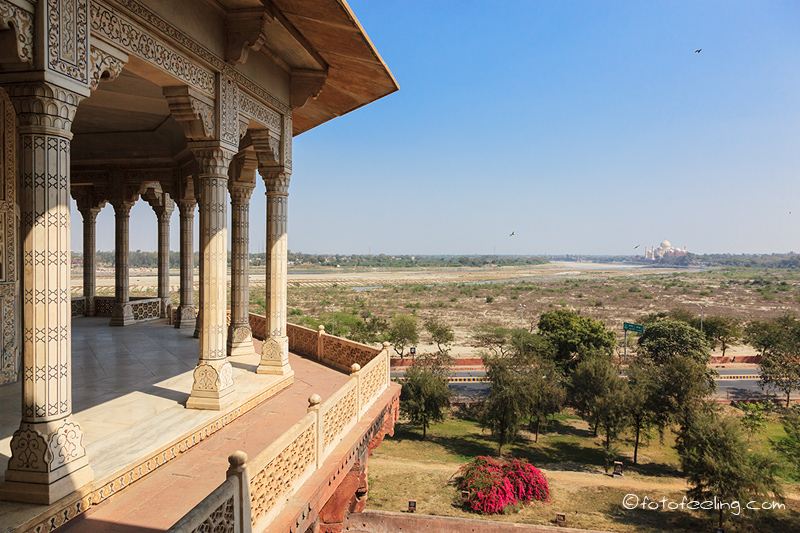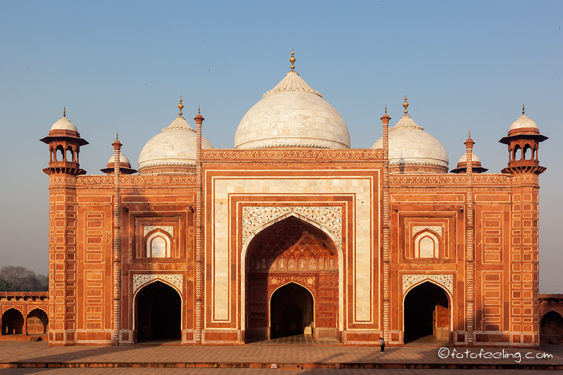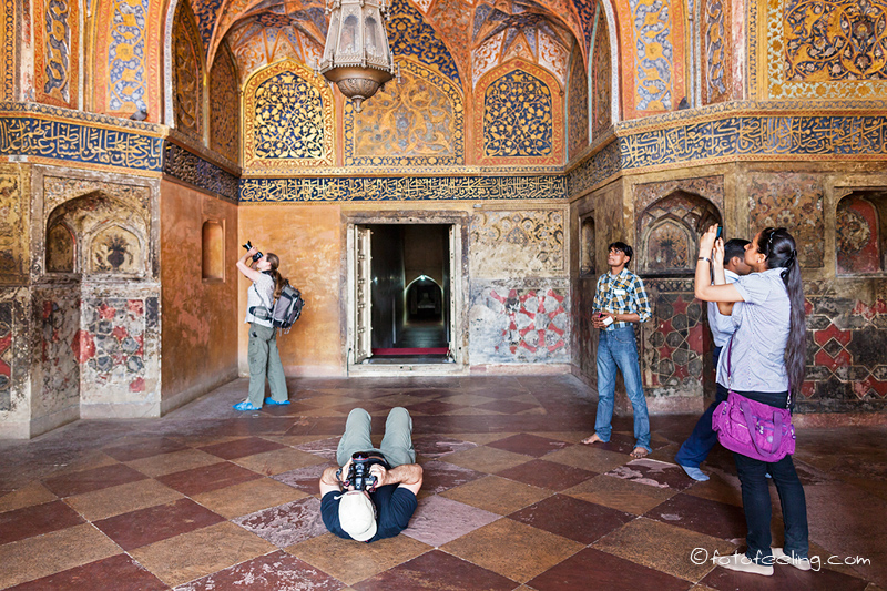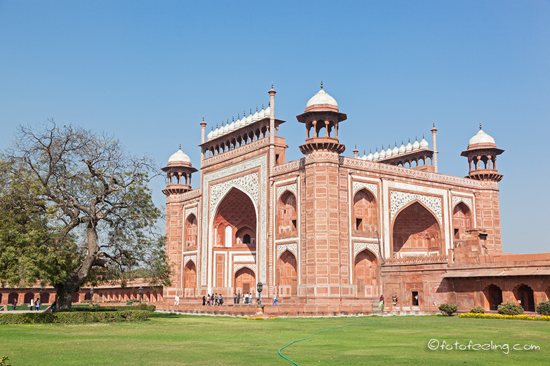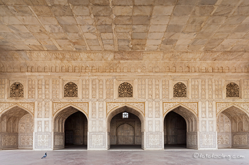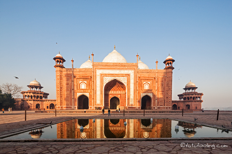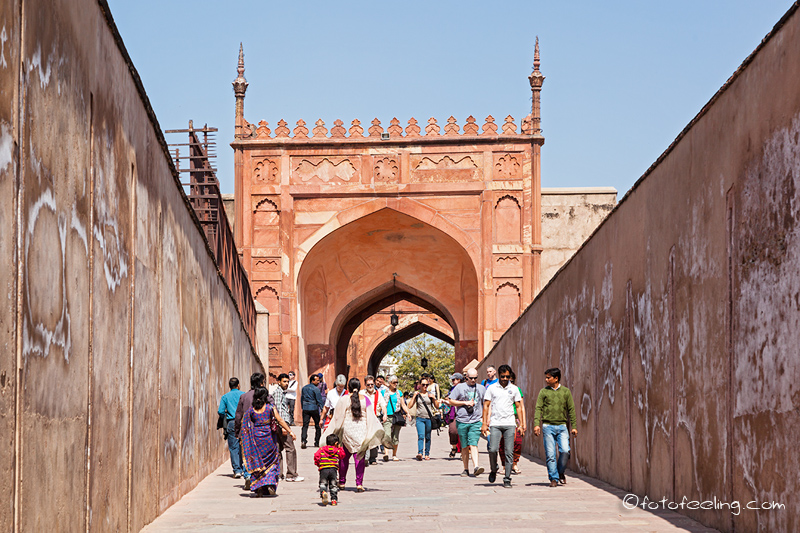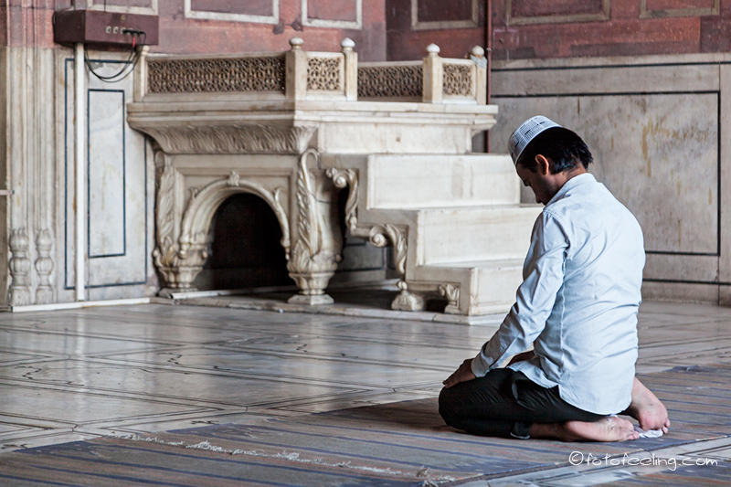 So hübsch bekleidet gingen wir dann in den 90 x 90 m großen Innenhof, der über 20 000 Gläubigen Platz bietet. In der Mitte des Platzes befindet sich ein Brunnen, um den viele Gläubige saßen. Auf der einen Seite des Platzes lag weit verstreut Taubenfutter aus. Darum gab es hier auch unzählige Tauben, die immer wieder über den Platz und um die Moschee flogen. Wir gingen zuerst direkt auf die Moschee zu. In der großen Gebetshalle knien die Menschen nieder und berühren mit dem Kopf den Boden. Ein Lehrer saß in einer Ecke und unterrichtete den Koran. Um ihn herum saßen dicht gedrängt Menschen und lauschten seinen Worten. Alles war so anders und fast schon auf Zehenspitzen ging ich durch die Halle der Moschee. Doch die Gläubigen ließen sich nicht stören. In Indien leben riesige Familien auf engstem Raum zusammen, Privatsphäre ist hier größtenteils ein Fremdwort, die Menschen sind sehr tolerant auch Fremden gegenüber. Da fühlten wir uns sicher oftmals als Störenfried, der aber gar nicht als solcher wahrgenommen wurde.