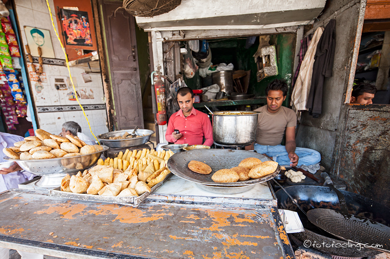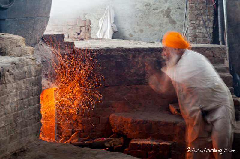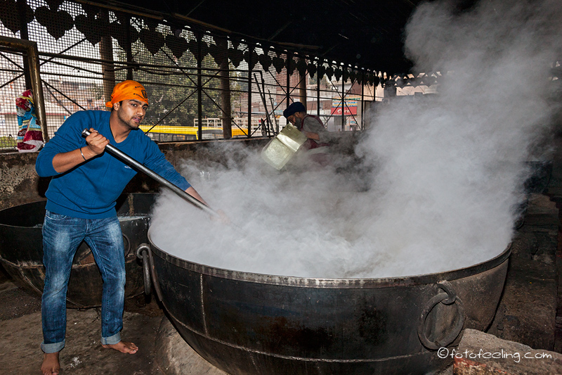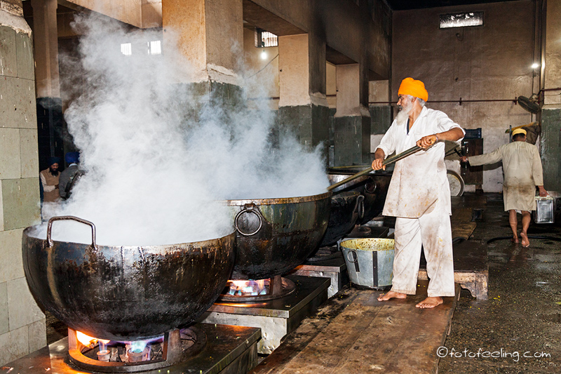 Als wir den Tempel durch den Eingang verlassen hatten, führte uns unser Reiseleiter über eine Seitenstraße in die Tempelküche. Ein riesiger Speisesaal, voll mit Menschen, die hier umsonst Essen bekommen, lag vor uns. Staunend gingen wir durch die Reihen. Hier saßen dichtgedrängt Menschen aller Kasten und Religion und aßen. Helfer gingen durch die Reihen und verteilten Brot oder füllten die Teller nach. Das Essen sah sehr lecker aus, aber wir waren absolut satt vom Frühstück und konnten nur fasziniert zusehen. Danach durften wir auch noch die Küche besuchen, wo wieder Freiwillige die Arbeit verrichteten. In riesigen Kupfertöpfen dampfte und brodelte es. Männer rührten mit langen Stangen um. Eindrücke prallten auf uns ein. Es war einfach fantastisch. Begeistert schauten wir in die Töpfe und schlenderten durch die Großküche. An einer anderen Stelle wurde Brot gebacken, freiwillige Helfer kneteten Teig und formten die typischen Fladen. Andere wendeten sie über den heißen Platten. Wir konnten uns kaum losreißen von diesem interessanten Ort.