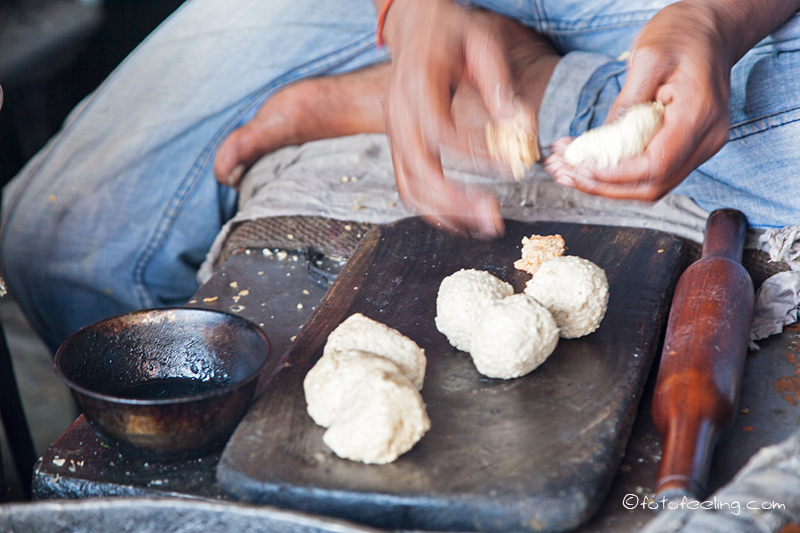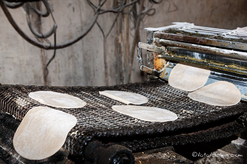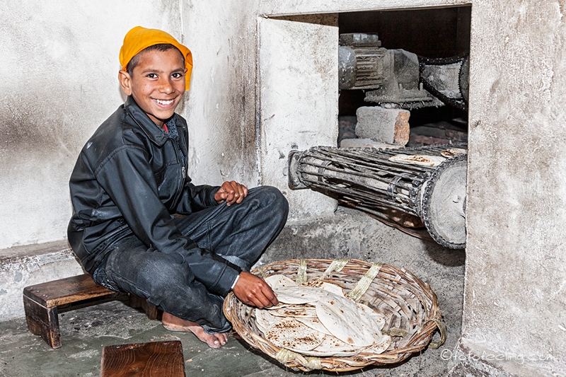 In einer kleinen Bäckerei stand eine elektrische Brotmaschine, die von einem Mann bedient wurde. Etwas weiter formte eine andere Maschine aus dem Teig kleine Kugeln, die dann in einem weiteren Arbeitsgang platt gedrückt wurden. So entsteht das typisch indische Brot, das Naan, das gerade im Norden des Landes zu allem dazu gegessen wird. Auch hier arbeiteten die Menschen wieder freiwillig in der Küche mit. Sonst würde dieses perfekte Tempelsystem nicht funktionieren.