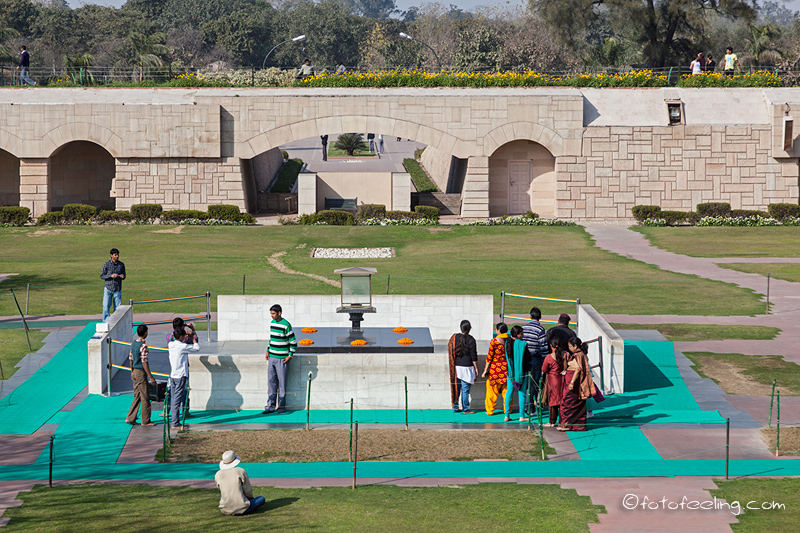 Nach diesem pulsierenden Leben kam uns der Besuch von Raj Ghat, der Ruhestätte von Mahatma Gandhi schon fast unwirklich ruhig vor. Aber dieser Ort ist ja auch ein Ort des Gedenkens und der Ruhe. Ein schwarzer Marmorblock auf dem eine ewige Flamme lodert markiert die Stelle, an der Mahatma Gandhi nach seiner Ermordung 1948 beigesetzt wurde.