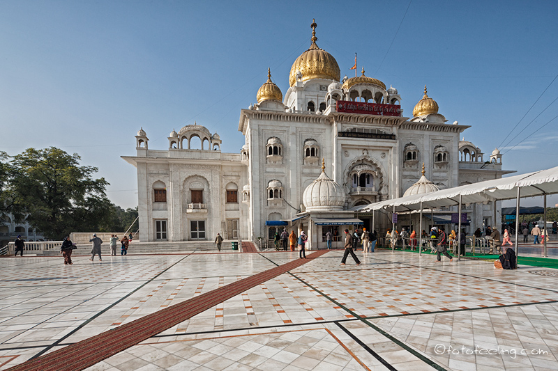 Überpünktlich um 8 Uhr morgens war unser etwas mürrischer Ranjid da und so fuhren wir zum Sikh Tempel Gurudwara Bangla Sahib in Delhi. Dort parkten wir ganz modern in einer Tiefgarage und gingen zu Fuß die letzten Meter bis zum Eingang des Tempels.