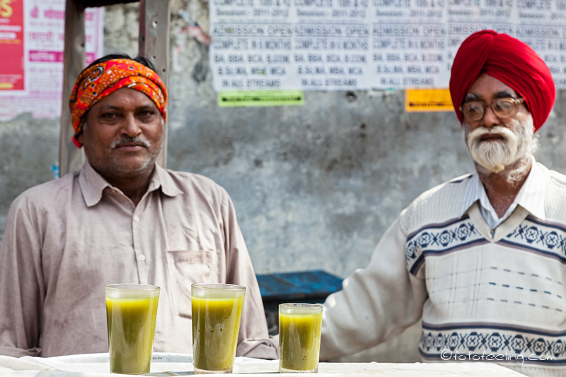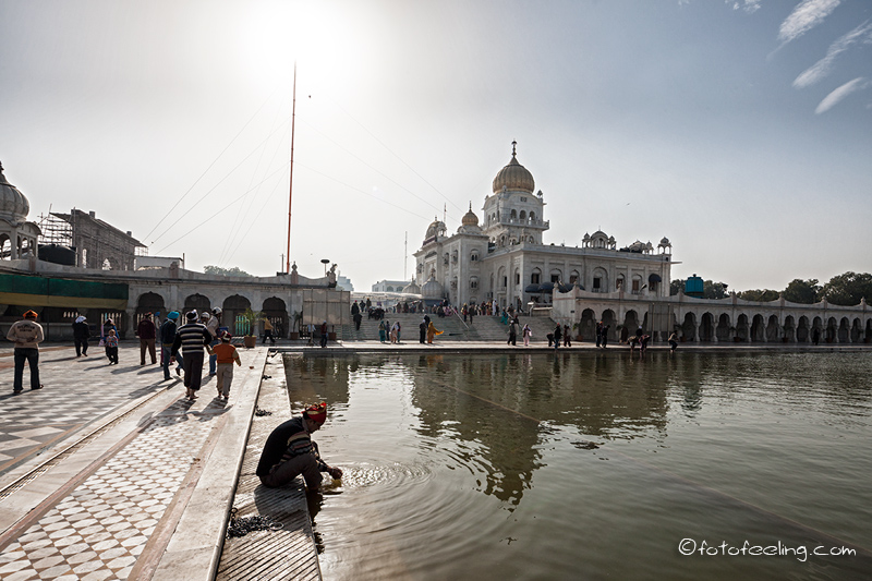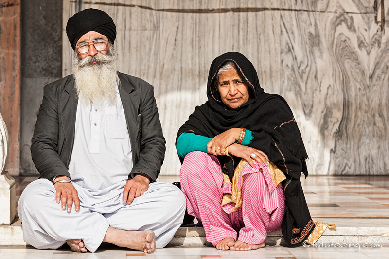 Nach dem Reinigen der Füße und Hände durften wir den Tempelbereich betreten. Hier war alles so ruhig und nichts vom Lärm und Stress Delhis war in diesem Tempel zu spüren. Wir setzten uns kurz in den Gebetsraum und lauschten ein paar Minuten der Lesung aus dem heiligen Buch, einem Sprechgesang. Danach gingen wir in den Innenbereich des Tempels, wo sich die goldenen Kuppeln in einem großen quadratischen Tempel-Teich spiegeln. Dem Wasser in dem Teich werden heilende Kräfte zugesprochen. Hier baden die Sikhs, beten oder genießen einfach die kleine Auszeit an diesem friedlichen Ort. Die Menschen waren sehr freundlich und nett und ließen sich gerne fotografieren. Dabei hatte es uns besonders ein älteres Paar angetan, das so in sich selbst ruhte und dabei Glück und Zufriedenheit ausstrahlte, wie man es heutzutage nur noch selten findet. Aber auch wir mussten wieder für Bilder ‚herhalten’.