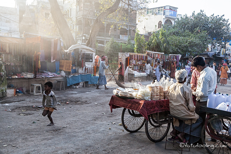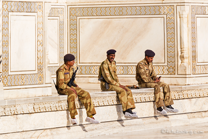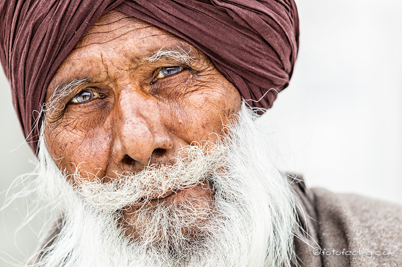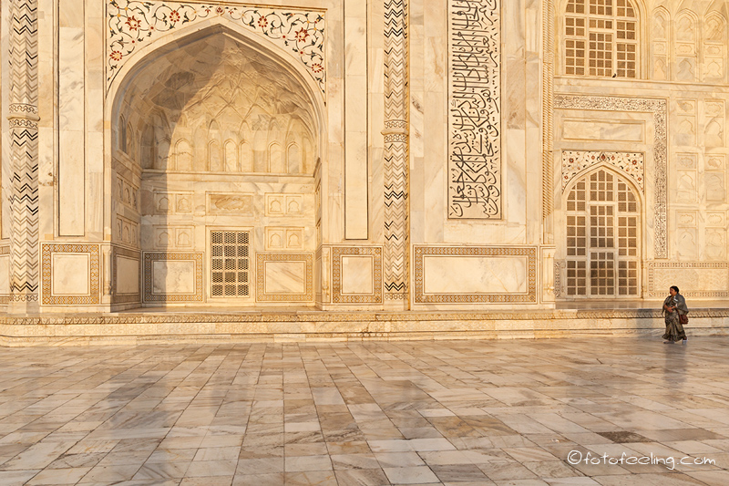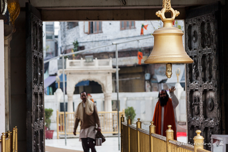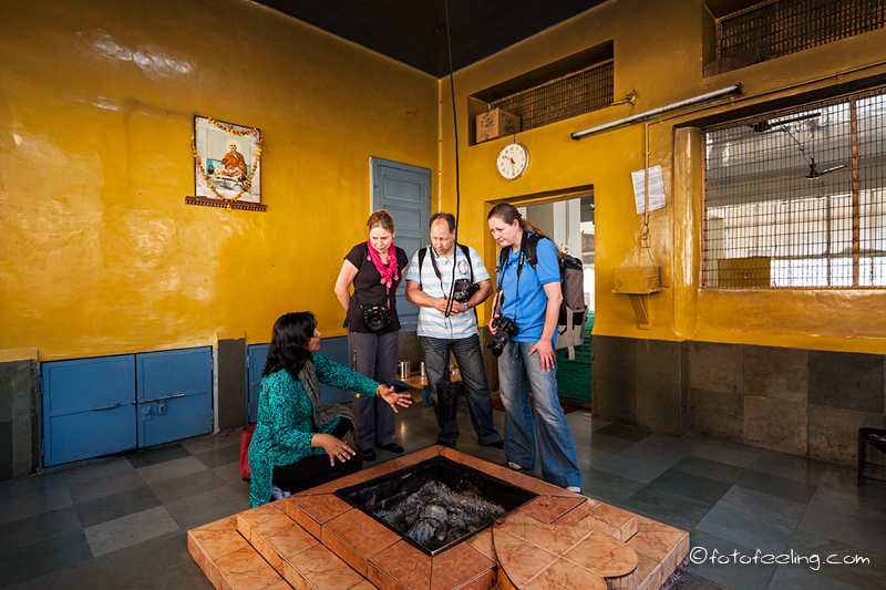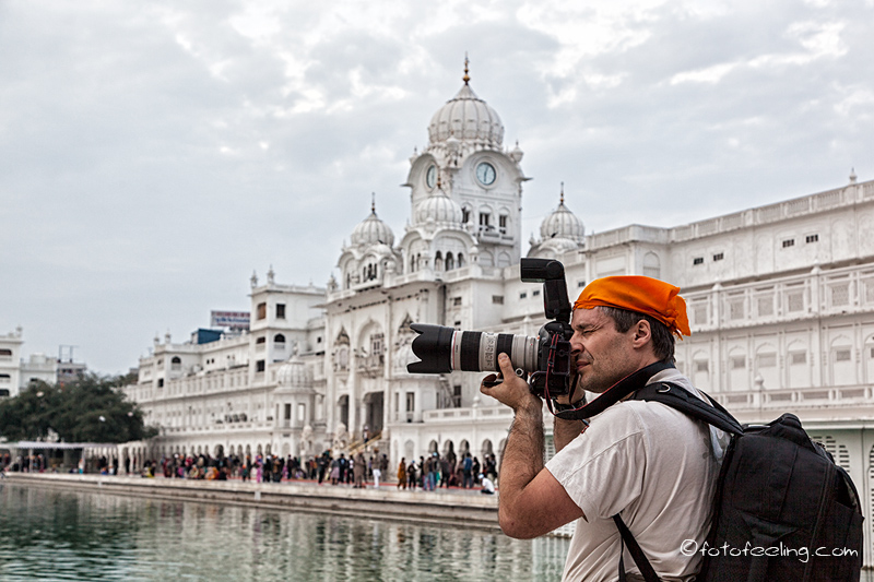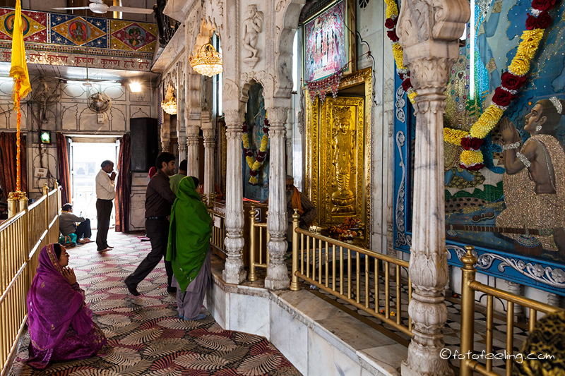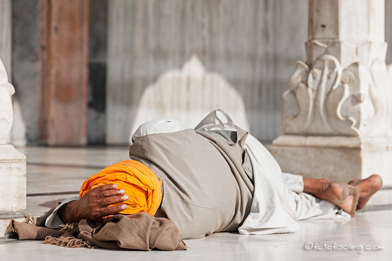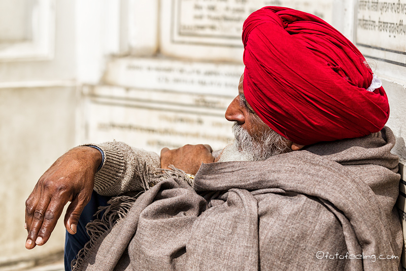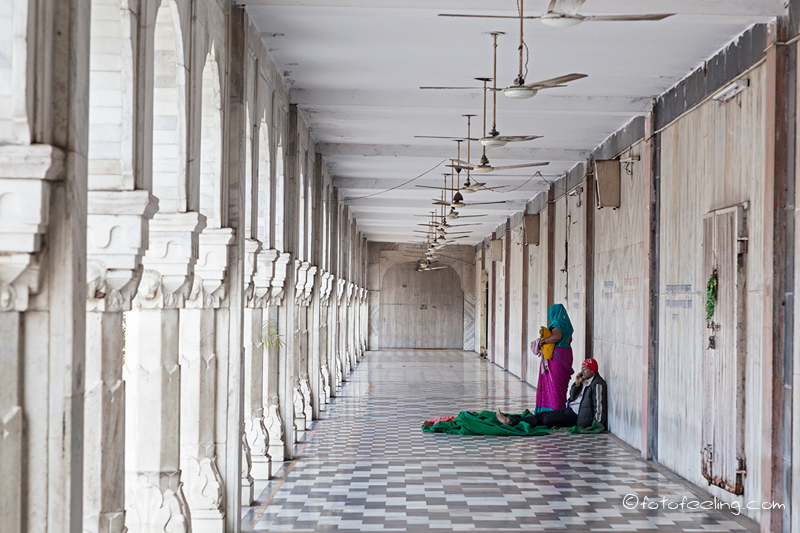 Die ganze Tempelanlage ist mit Marmor ausgelegt, der an diesem Morgen extrem rutschig war, so dass man ganz genau aufpassen musste wohin man ging. Wir umrundeten den Tempel mindestens einmal, fotografierten was die Kameras hergaben und waren einfach nur fasziniert und begeistert. Auch hier waren die Menschen wieder absolut nett und sehr geduldig mit uns Fotografen. Wenn wir sie fragten, ob wir fotografieren dürfen, nickten sie fast immer in typisch indischer Art, indem sie den Kopf leicht und bedächtig schüttelten. Aber mit der Zeit wussten wir was ja oder nein heißt. Danach machten sie einfach normal weiter ohne noch groß auf einen zu achten, dadurch wirkten sie sehr souverän und stolz auf uns und auch die Bilder wirken eigentlich nicht gestellt, sondern eher natürlich. Ich könnte das nicht, denn wenn auf mich eine Kamera gerichtet ist, versteife ich mich und schaue aus, als ob ich auf eine Zitrone gebissen hätte. Umso mehr beneidete ich die Menschen um ihre Natürlichkeit.