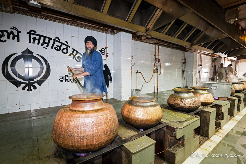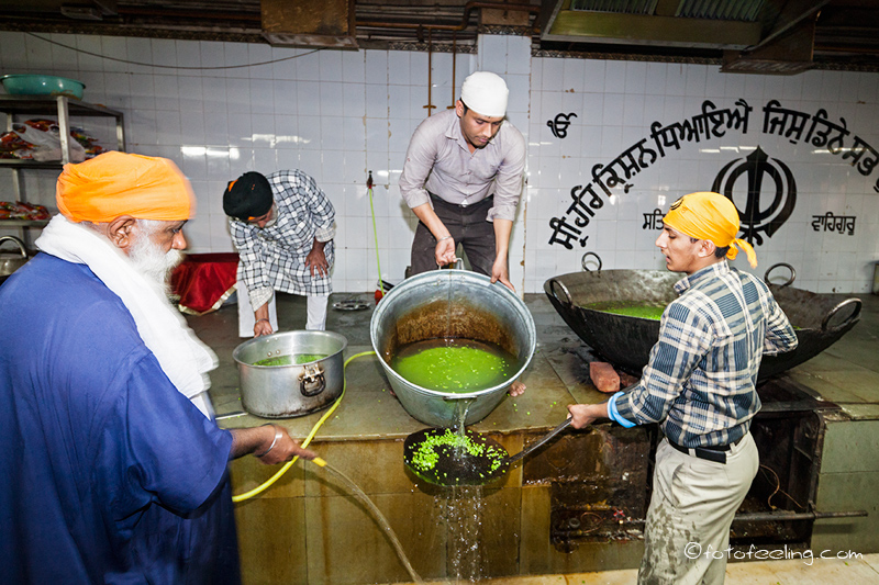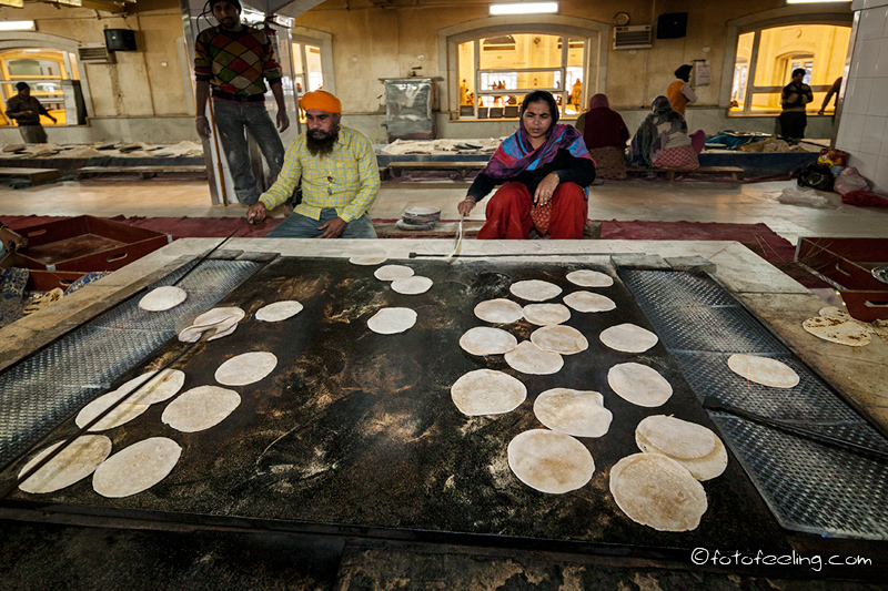 Auch hier in Amritsar durften wir die Tempelküche besuchen. Die Küche produziert am Tag zwischen 60000 – 80000 vegetarische Gerichte. Im Guru-Ka-Langer - dem Speisesaal, erhalten alle Menschen, ungeachtet ihrer Religion und Nationalität kostenlos eine Mahlzeit. Gegessen wird in langen Reihen sitzend auf dem Fußboden. Helfer verteilen das Essen und das Brot.