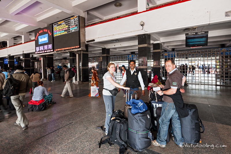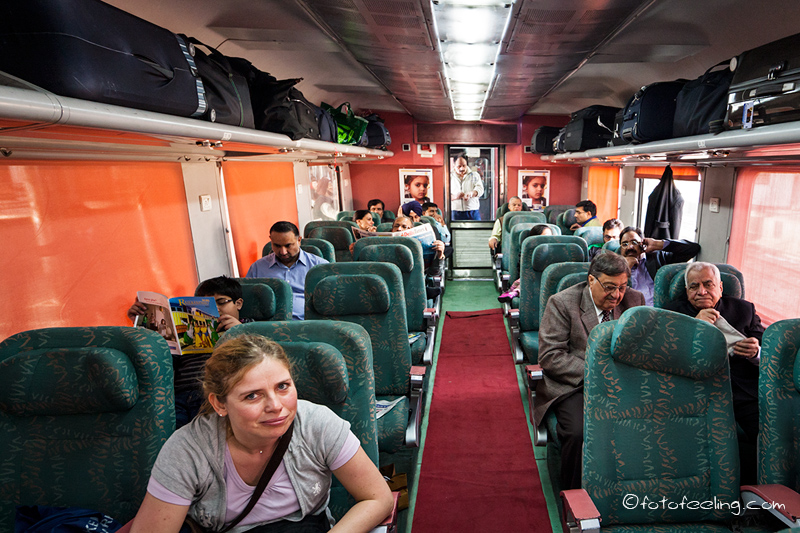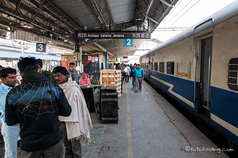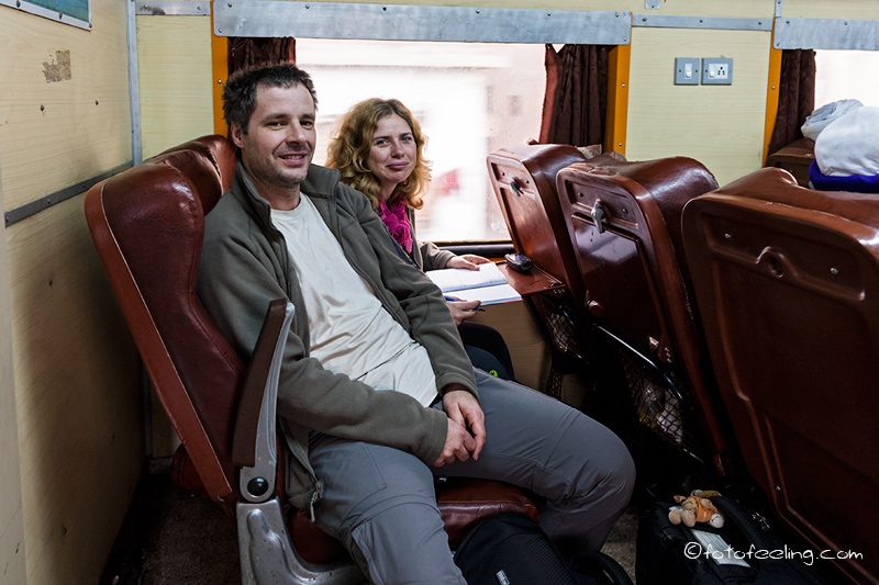 Wir fuhren ins Hotel, packten unsere Taschen und bezahlten die Rechnung. Sehr nett fanden wir auch, dass wir die Zimmer bis 15 Uhr behalten durften. Dann ging es zum Bahnhof, wo unser Zug (Abfahrt um 16:30 Uhr) schon angeschrieben stand. Hier warteten wir noch eine Zeit bis unser Zug kam. Uwe musste sich mal wieder kümmern, denn unser Reiseleiter hatte keine Ahnung wohin wir mussten, aber mit Uwes Hilfe war alles kein Problem. Als der Zug pünktlich einfuhr standen wir schon fast an der richtigen Tür. Auf einer Liste neben der Zugtür fanden wir unsere Namen angeschrieben, so dass wir schnell das richtige Abteil fanden. Doch nur drei Plätze waren nebeneinander. Mein Platz lag etwas abseits. Zum Glück tauschte ein Junge mit mir und so konnte ich bei Chris sitzen bleiben. Auch wenn die Sitze etwas abgewohnt waren, so merken wir, dass wir in der 1. Klasse saßen. Wir hatten viel Platz und konnten sogar mit unseren zwei Fotorucksäcken bequem sitzen. Einzig die Sitzeinteilung war etwas komisch. So ging die Hälfte der Sitze in eine Richtung und die andere in entgegen gesetzter Richtung. Wir hatten Pech, wenn man es so ausdrücken möchte und fuhren rückwärts unaufhaltsam Amritsar entgegen.