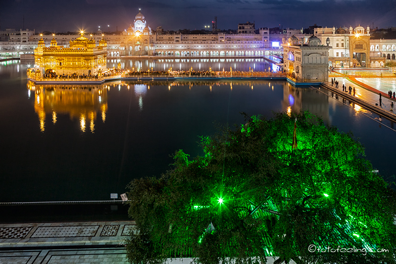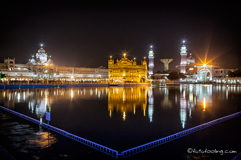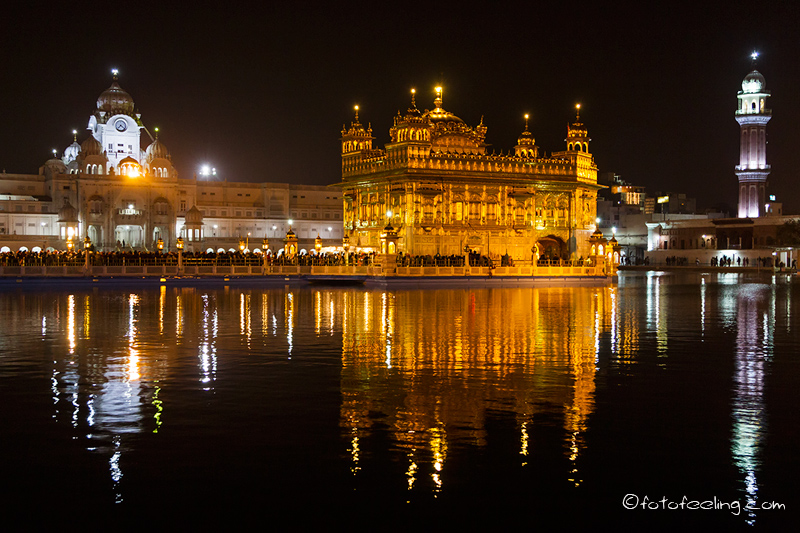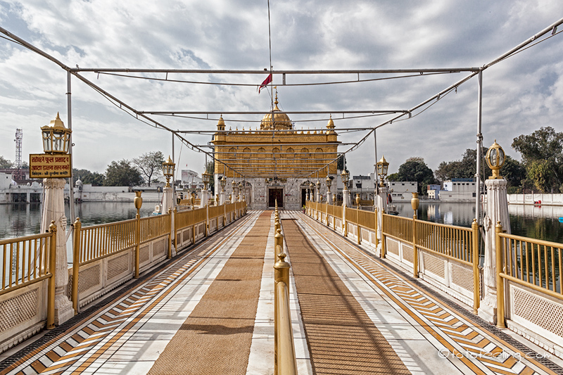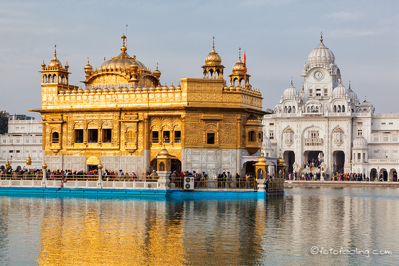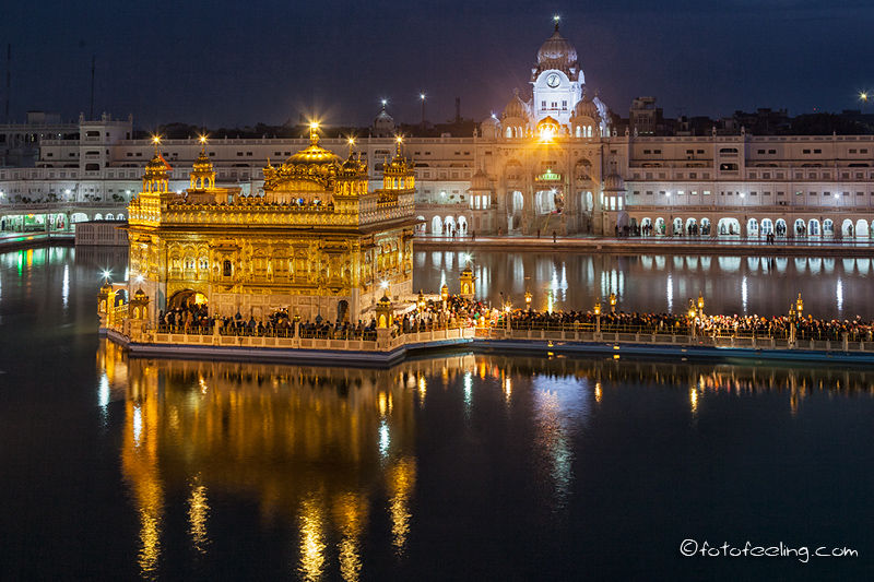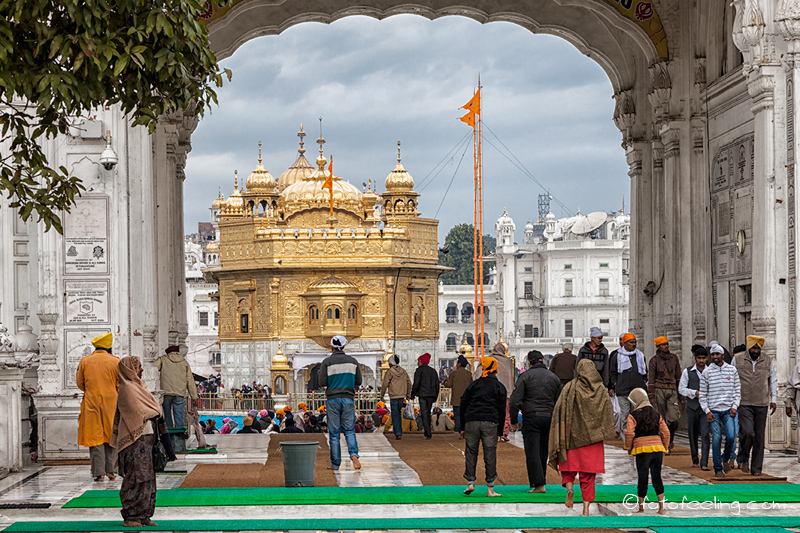 Als wir durch das Eingangstor kamen, sahen wir den Goldenen Tempel – Hari Mandir (Harmandir Sahib) zum ersten Mal mit eigenen Augen. Imposant thronte der zweistöckige Marmortempel mitten im heiligen Amrit Sarovar (Nektarteich) vor uns, dem die Stadt ihren Namen verdankt, und ist nur über einen Steg (die Gurus-Brücke) aus zu erreichen.