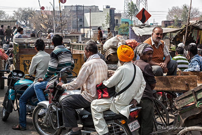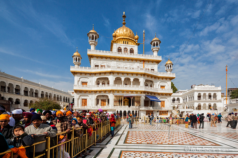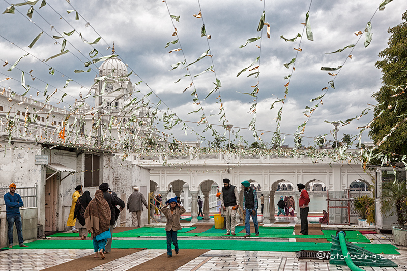 Pünktlich um 8.30 Uhr holten uns Paul und Bundy ab. Auch in Amritsar herrschte buntes Treiben auf den Straßen. Alles war mit Fahrrädern, Rikschas, Mopeds, Autos und Menschen verstopft. Das Hupen und Klingeln dröhnte in den Ohren, alles ging wieder drunter und drüber und trotzdem irgendwie geordnet ab. Jedenfalls quetschten wir uns durch den Verkehr der größten Stadt des Bundesstaates Punjabs bis wir ganz in der Nähe des Goldenen Tempels waren. Ein Teil des Weges war gesperrt und so gingen wir mal wieder zu Fuß durch die Gassen bis zum Tempel. Paul geleitete uns zur ‚Schuhannahmestelle‘ und sorgte dafür, dass alle unsere Schuhe zusammen abgestellt wurden. Auch hier passten wieder freiwillige Helfer auf die Schuhe der Pilger und Tempeltouristen auf. Es kostete uns schon etwas Überwindung die Schuhe und auch die Socken abzulegen, denn die Wege waren noch feucht vom Regen und es war sehr frisch an diesem Morgen. Am Eingang mussten wir wieder zuerst die Hände und dann die Füße waschen, wobei Tempelwächter ein Auge darauf hatten, dass dieses Ritual auch eingehalten wird. Das Badewasser für die Füße war an diesem kalten Morgen richtig angenehm warm, sodass wir gerne durchliefen. Kopftücher gab es kostenlos am Eingang oder bei der Schuhannahme. Nun waren wir richtig ausgestattet und konnten uns ins Getümmel der Tempelanlage stürzen.