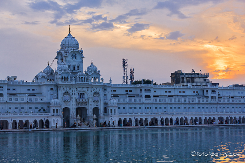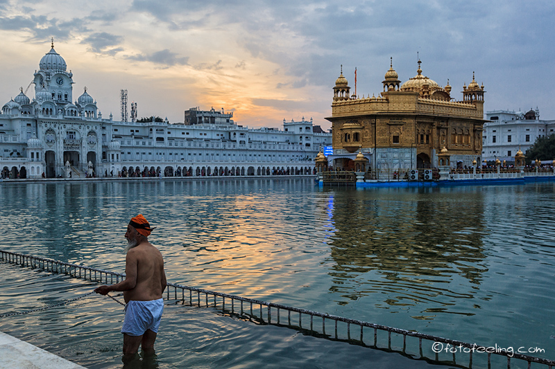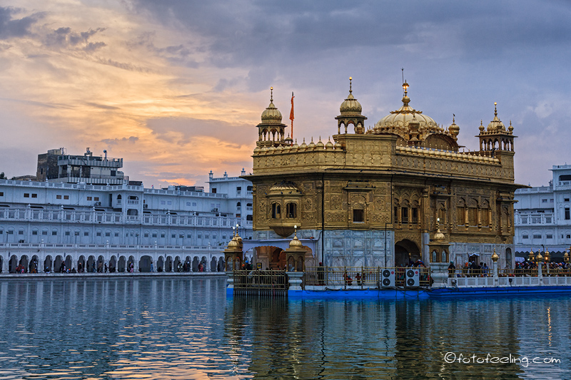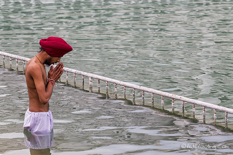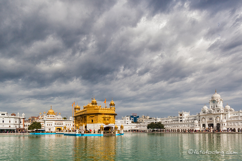 Am und im Wasser beteten Menschen. Es war richtig viel los an diesem Morgen. Die Wolken hingen dramatisch über dem Tempelgelände, doch ab und zu blitzte mal die Sonne durch. In solch einem Moment erstrahlte das Gold des Tempels wunderschön im Licht, so dass man die Augen kaum abwenden konnte. Trotz der vielen Menschen strahlte dieser Ort eine ganz besondere Atmosphäre aus und so wunderte es uns nicht, dass dieser Sikh Tempel mehr indische Besucher anzieht als das Taj Mahal.