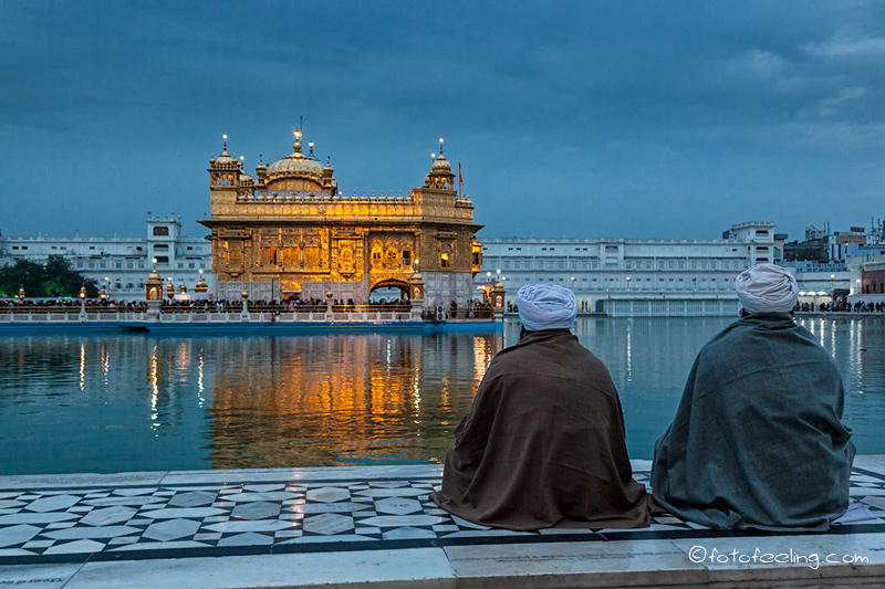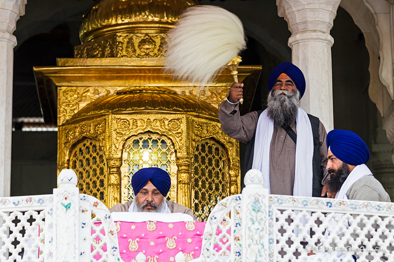 Priester rezitieren ununterbrochen in Gurmukhi aus dem heiligen Buch der Sikhs, was über Lautsprecher im gesamten Tempelbereich übertragen wird. Das erste heilige Buch, der Guru Granth Sahib (auch Adi Granth, Ur-Buch genannt), wird tagsüber unter einem Tuch im Hari Mandir Sahib (dem Goldenen Tempel) aufbewahrt und abends in den Akal Takhat (den Sitz der obersten religiösen und politischen Autorität der Sikhs) zurückgebracht. Dieser Zeremonie kann man beiwohnen, was wir uns für den Abend vornahmen. Doch vorerst wollten wir das Tempelgelände erkunden.