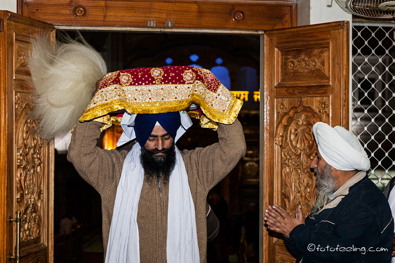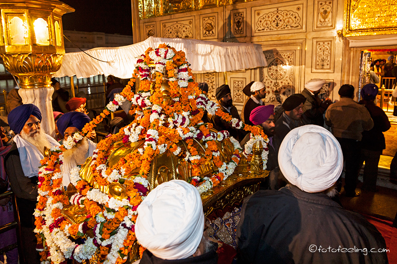 Zurück im Akal Takhat konnten wir beobachten, wie das zweite Heilige Buch ins Bett gebracht wird. Mit einer Zeremonie und Singsang wurde es in ein Zimmer begleitet, in dem ein Holzbett mit bestickten Tüchern liegt. Dort wurde es unter die Decken gebettet und der Raum verschlossen. Etwas unheimlich war uns der Fanatismus der Leute. Sie quetschten sich zum Teil fast rücksichtslos an einem vorbei um einen Blick auf das Buch werfen zu können. Am liebsten hätten sie es angefasst. Sie wirkten völlig entrückt und wie in Trance.