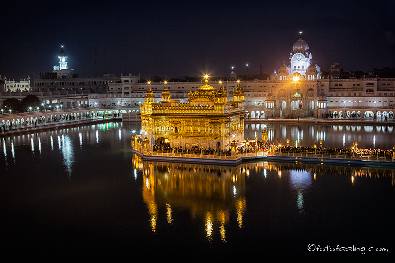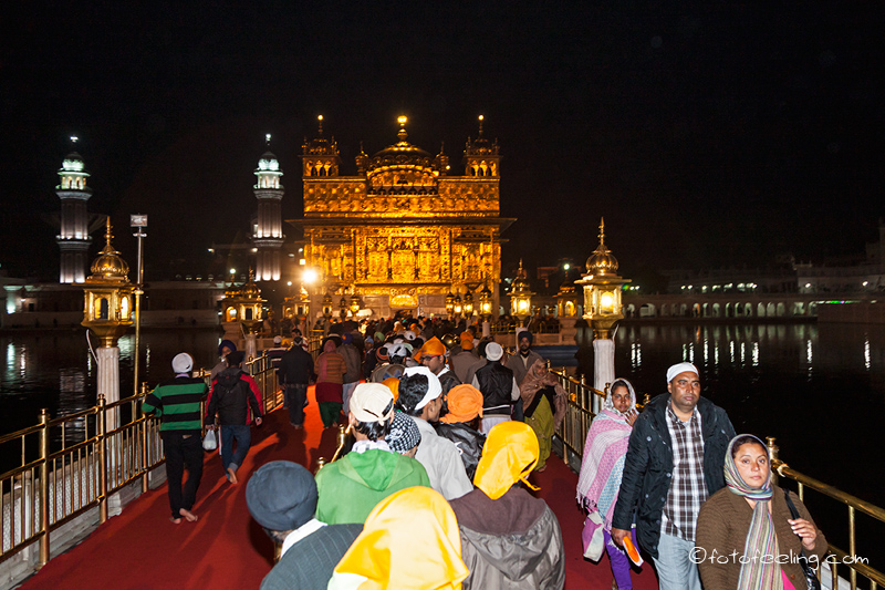 Dann kam der eigentliche Höhepunkt des Abends. Paul lotste uns zum Zugang der Brücke des Goldenen Tempels, in dem ja tagsüber das Heilige Buch ist. Von dort wird es zurück zum Akal Takhat gebracht, wo es wiederum in ein verglastes Zimmer mit einem tollen Holzbett und wertvoll bestickten Decken geleitet wird.