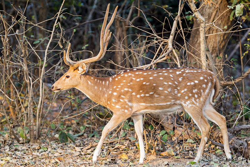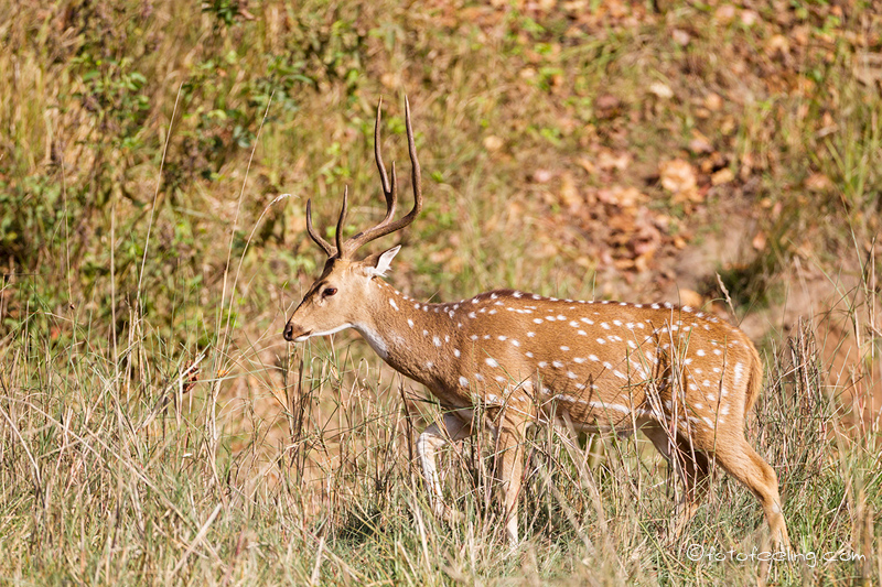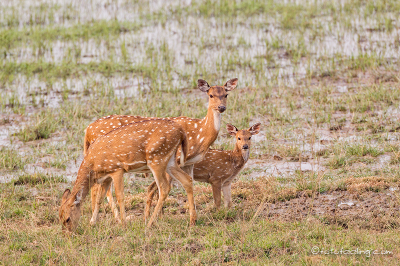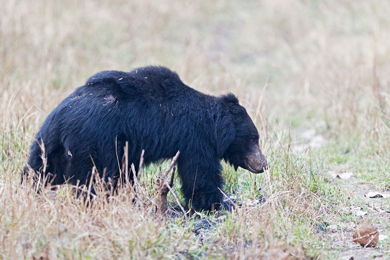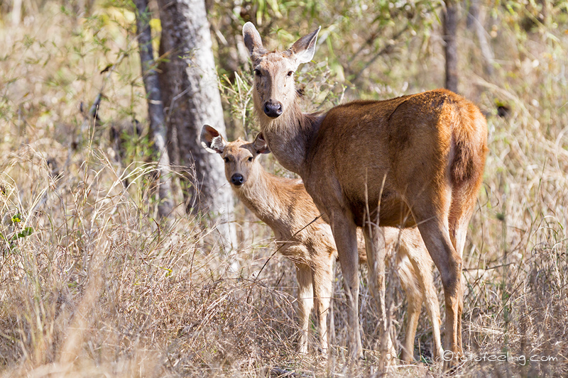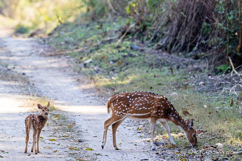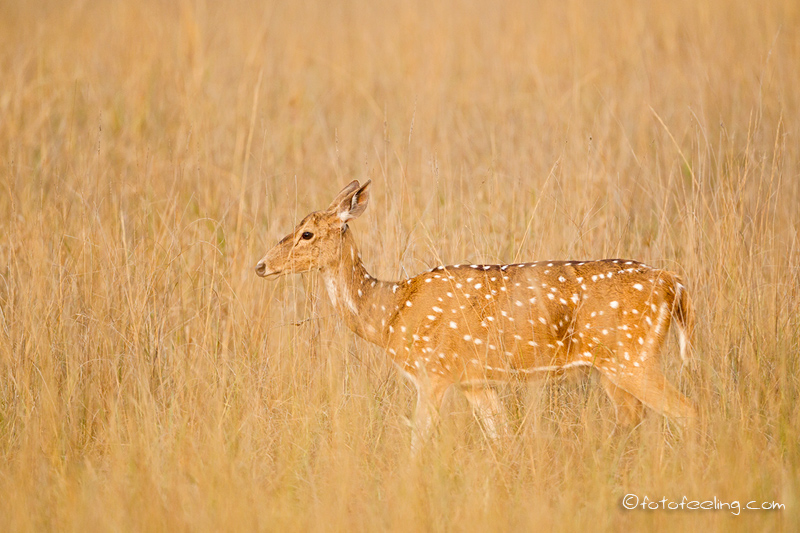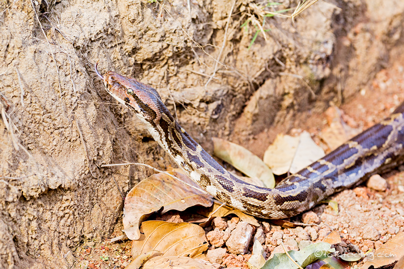 Morgens fuhren wir angespannt auf verräterische Warnrufe der Hirsche achtend durch den Wald, beobachteten die weiten Grasflächen und lauschten den Geräuschen der Vögel. Doch meistens tat sich nichts. Die Landschaft lag friedlich im Morgendunst vor uns, Vögel zwitscherten und der allgegenwärtige Ruf der Pfauen erschall durch den Wald. Sambar Hirsche liefen durch das Gras, aufgeweckte Hirschkälber folgten den Müttern. Gaur fraßen auf den Wiesen und wir entdeckten sogar die Sensation des Parks, ein weißes Bisonkalb, das mit neugierigen Augen die Welt betrachtete. Zweimal konnten wir einen Lippenbären für kurze Zeit beobachten. Diese zotteligen schwarzen Gesellen, schauen richtig niedlich aus, aber leider waren sie auch sehr scheu und suchten schnell das Weite. Ein weiteres Highlight war ein Tigerpython, der neben der Straße lag und sich dann langsam die Böschung hinaufarbeitete, dabei mit der Zunge die Umgebung abtastete und das Laub raschelnd zur Seite schob. Ein Morgen war besonders spannend, als wir Mahuts mit ihren Elefanten durch das Gras laufen sahen. Ein Tiger sollte in der Nähe sein, doch für uns wäre er mitten im Grasland unerreichbar weit weg. Für die Elefanten wäre er jedoch auffindbar gewesen, aber leider hatte sich der Bursche unsichtbar gemacht.