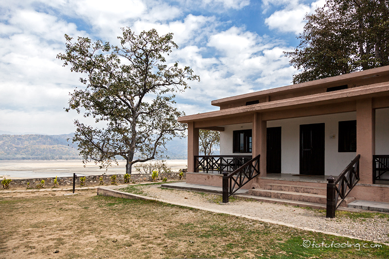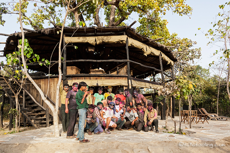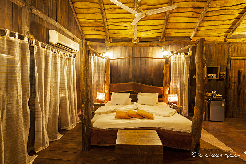 Im kleinen Ort Mocha musste unser Speedy dann doch noch eine kurze Zwangspause einlegen, denn hier wusste er nicht mehr weiter. Nach einem Telefonat mit unserer Lodge holperten wir dann ein wenig langsamer eine Piste entlang. Diesmal sahen wir etwas mehr von den schönen Reisfeldern, die jedoch erst im Monsun bepflanzt werden und jetzt etwas trostlos vor uns lagen. Wir fuhren durch ein paar kleine Dörfer, sahen Frauen an den Brunnen Wasser schöpfen und Kühe über die Felder wandern. Dann bogen wir noch in eine letzte Abzeigung ein und standen vor der ‚Flame of the Forest’ Lodge, besser gesagt vor dem Eingangsgate, die Lodge erreicht man erst nach dem Überqueren einer kleinen Holzbrücke. Karan, der Besitzer der Lodge, erwartete uns schon mit einem leckeren Getränk. Nach der langen Fahrt war das genau das Richtige. Karan hat sich hier zusammen mit seiner Frau Isa einen Traum verwirklicht und eine kleine individuelle Lodge erschaffen, die nicht nur sehr luxuriös ist, sondern auch vor Herzlichkeit nahezu strahlt.