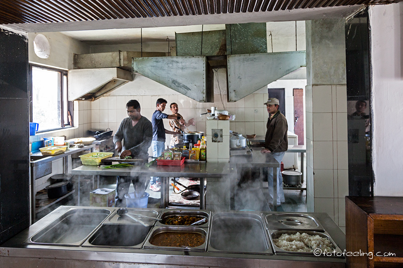 In einer etwas moderneren Küche wurde mit Gas gekocht. Riesige Töpfe mit Gemüse oder Reis brodelten auf offenem Feuer vor sich hin, von Männern mit riesigen Kochlöffeln umgerührt. Überall herrschte ein geschäftiges Treiben und doch sahen wir nirgends Hektik.