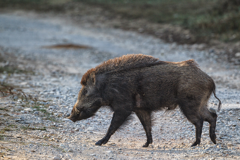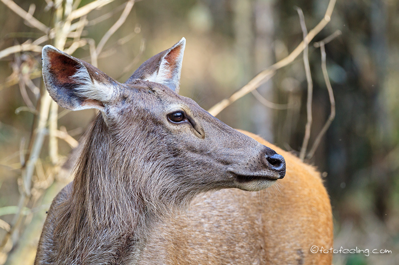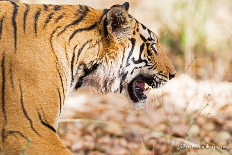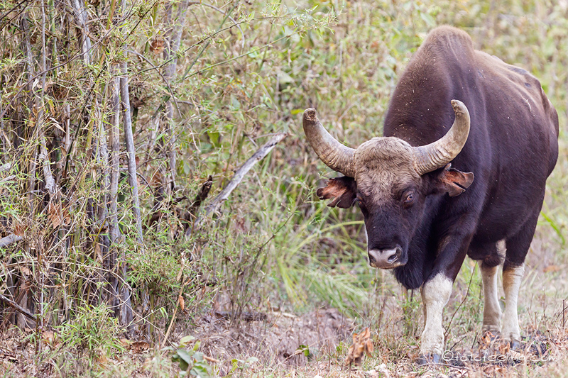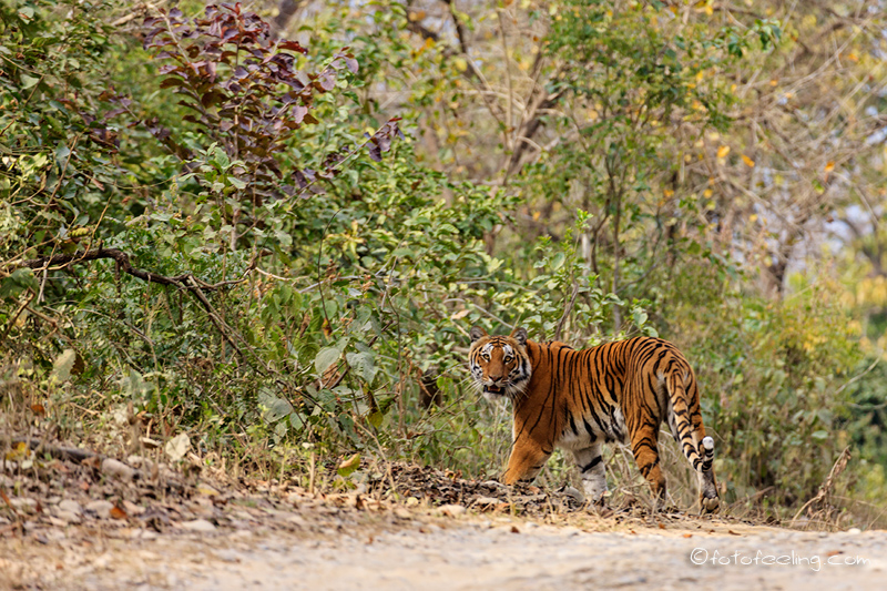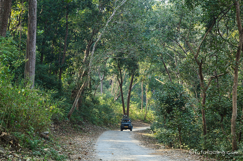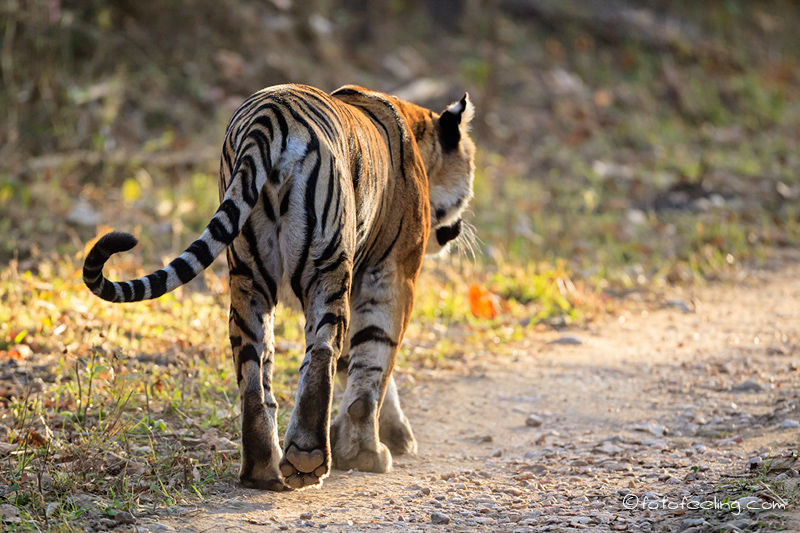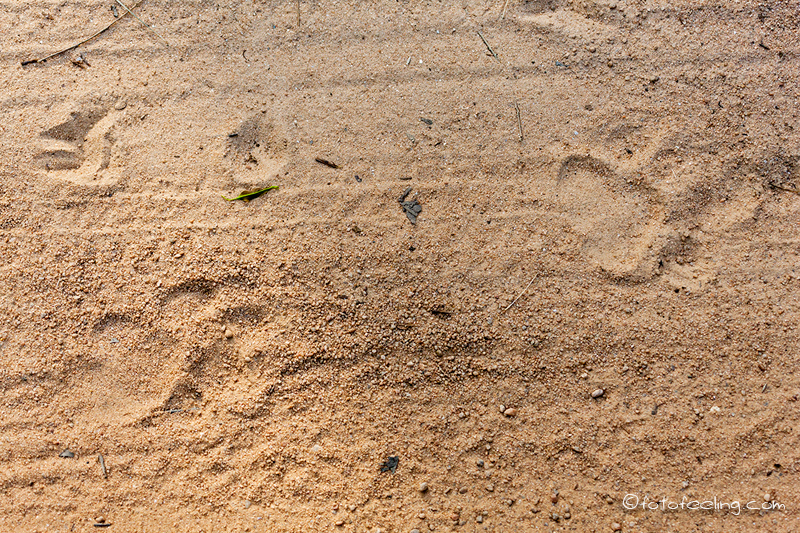 Unser Fahrer wollte uns unbedingt einen weiteren Tiger zeigen und folgte jedem kleinen Hinweis. Wir waren auch sehr nah dran, denn einmal warnten ganz in der Nähe Sambar Hirsche und beim zweiten Mal sahen wir extrem frische Pfotenabdrücke auf unserem Weg und auch noch Speichelspuren daneben. Unser Fahrer und der Guide waren extrem angespannt und horchten lange in den Wald. Doch leider hatten wir den Burschen um weniger als eine Minute verpasst. Hätten wir nicht den riesigen Gaur-Bullen auf dem Weg beobachtet, hätten wir vielleicht den Tiger gesehen…, aber wer weiß das schon. Wir patroullierten den Weg hoch und runter, aber der Tiger zeigte sich nicht mehr, dann war es auch schon Zeit für den Rückweg, denn auch hier gibt es empfindliche Strafen, wenn man sich nicht an die Zeiten hält.