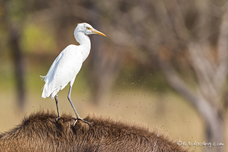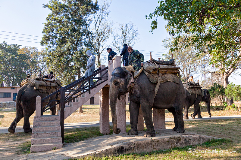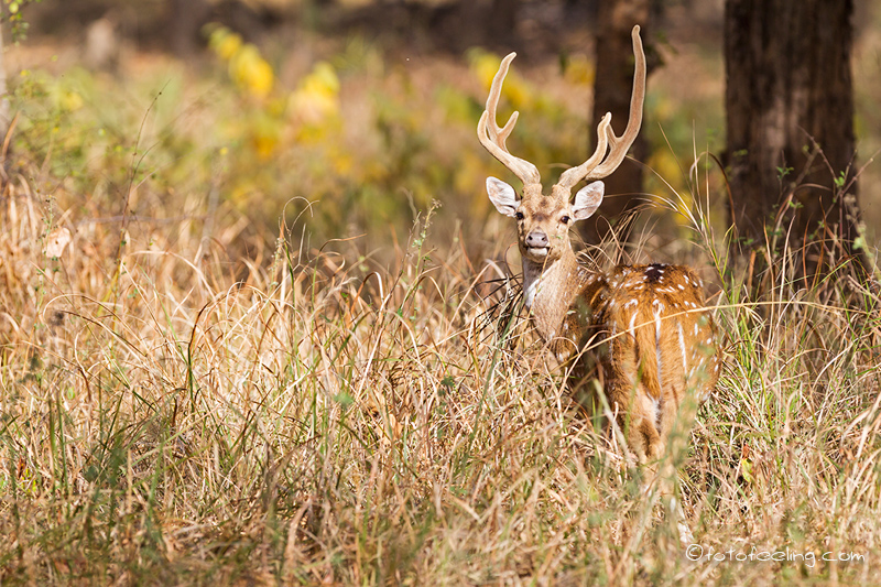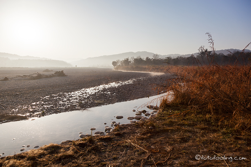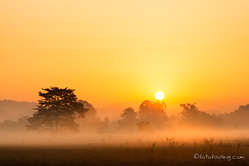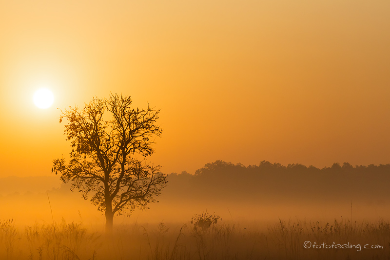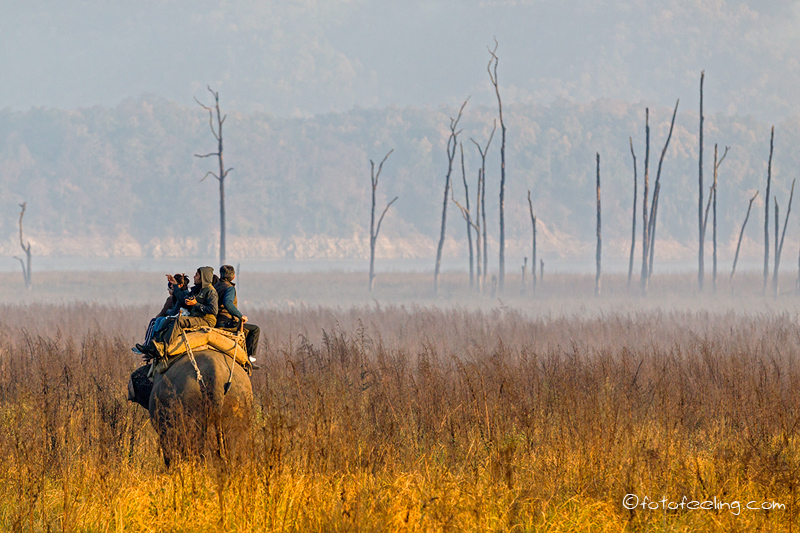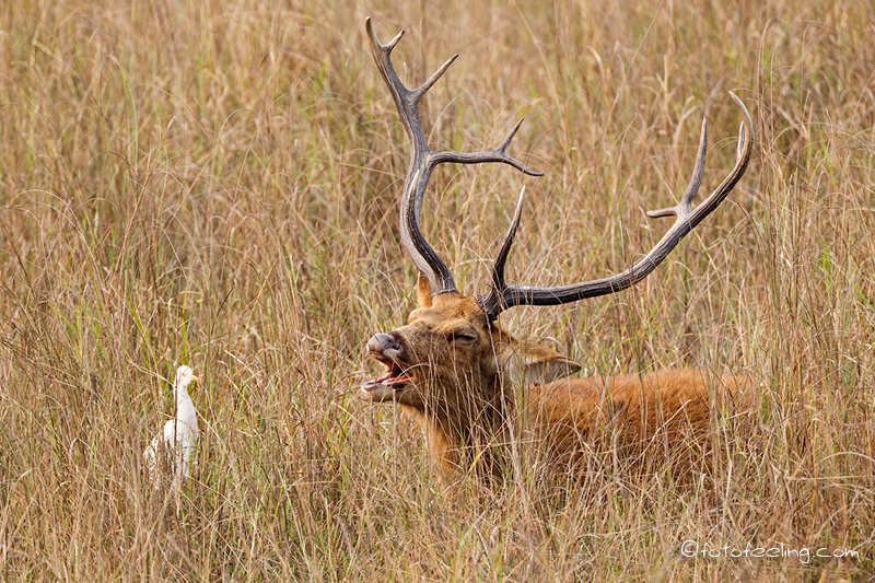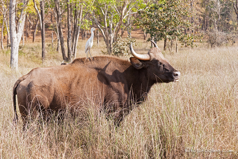 Hier gab es nach einer kurzen Pause auch schon Mittagessen, das wiederum absolut schmackhaft war. Danach relaxten wir noch etwas auf unserem Außen-Himmelbett und lasen ein wenig. Viel zu schnell verging die Zeit und schon saßen wir wieder im Jeep und fuhren zum Khatia Gate. Hier entschied unser Fahrer, dass wir einen anderen Weg fahren und so umrundeten wir einen kleinen See. Ganz in der Nähe standen im hohen goldgelben Gras einige indische Bisons, sogenannte Gaur und fraßen gemütlich. Kuhreiher standen auf ihren Rücken und beäugten uns kritisch, während einige Kälber spielerisch durch das Gras streiften.
