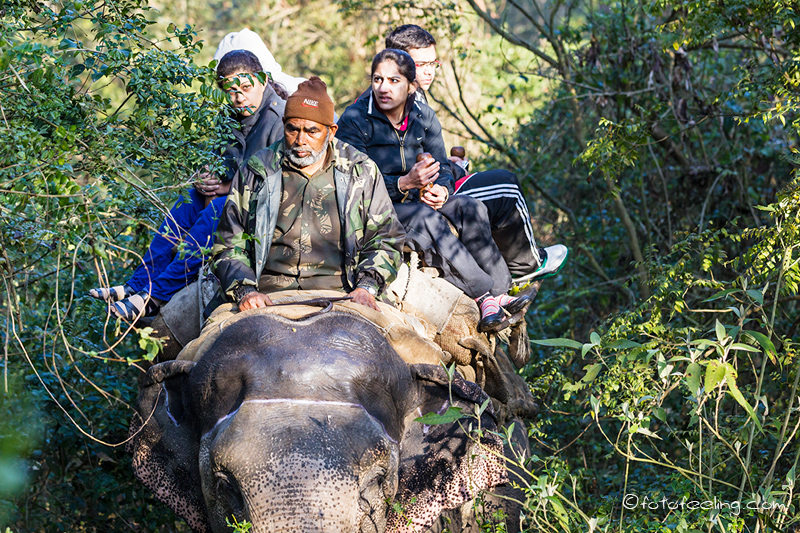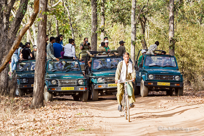 Auf einmal tat sich in den hinteren Reihen was, sollte da etwa ein Tiger unbemerkt herangekommen sein? Bei dem Krach der Leute wäre das sicher möglich, aber es war kein Tiger, sondern ein Parkmitarbeiter. Das skurrile an der Begegnung war, dass wir alle in den Jeeps auf den Tiger warteten, der im Gebüsch schlafen sollte und der Arbeiter auf seinem Rad an den Jeeps vorbeifuhr. Dementsprechend war auch die Belustigung der Massen.