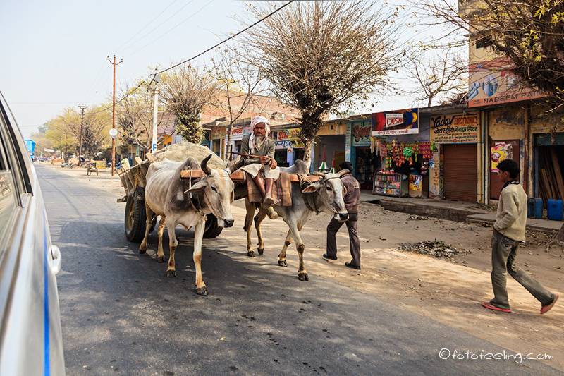 Die Straße war relativ gut, zwar kamen immer wieder kurze Schlaglochabschnitte, aber dann war kilometerweit die Strecke super. Immer wieder sahen wir Hunde oder Kühe auf der Straße. Farbenfroh gekleidete Frauen liefen mit Brennholz beladen auf dem Teer, Kinder winkten uns vom Straßenrand aus zu, Eselskarren mit Ziegeln beladen kamen uns entgegen. So zog sich die Straße ländlich idyllisch über 240 km bis hin zum Bandhavgarh Nationalpark. Die letzten 10 km durch den Park waren eine wirklich fiese sehr enge Schlaglochpiste, sozusagen eine Geschwindigkeitsbegrenzung auf indisch. Nur in den Dörfern war der Teerbelag heil und wir konnten kurz verschnaufen, schon holperten wir weiter unserem Ziel, dem Bandhavgarh Nationalpark entgegen.