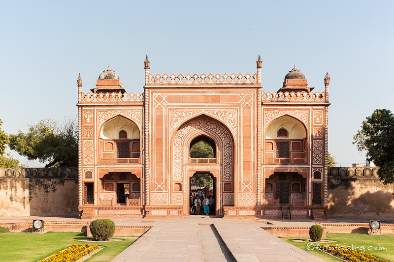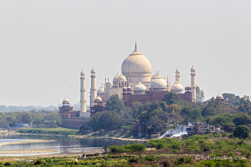 Eigentlich sollten wir hier die Lichtershow am Abend erleben, aber dafür war es einfach noch zu früh und gut 2 Stunden wollten wir nicht warten. So fuhren wir noch einmal zurück in die Stadt bis zum Roten Fort, in der Hoffnung dort noch den Sonnenuntergang erleben zu können. Doch leider hatten wir nicht mit dem Verkehr gerechnet und so zogen sich die knapp 9 Kilometer bis zum Fort ganz schön in die Länge. Auf einem Parkplatz setzte uns unser Fahrer ab und von dort aus gingen wir noch ein Stück Straße zu Fuß. Zuerst mussten wir schon auf dem Fußgängerweg Autos ausweichen, die sich hupend einen Weg durch die Menschenmengen bahnten. Dann sollten wir noch eine völlig verstopfte mehrspurige Straße überqueren. Den ersten Teil der Straße schafften wir relativ mühelos, doch dann kletterten und balancierten wir noch auf den erhöhten Mittelstreifen (1 m hoch) bis wir einen Weg auf die andere Straßenseite gefunden hatten. Das kam einem so richtig unwirklich vor und unser Reiseführer, den wir mittlerweile ‚Ranjit, die Träne‘ getauft hatten, schaute sich nicht mal nach uns um, sondern bahnte sich stur seinen Weg.