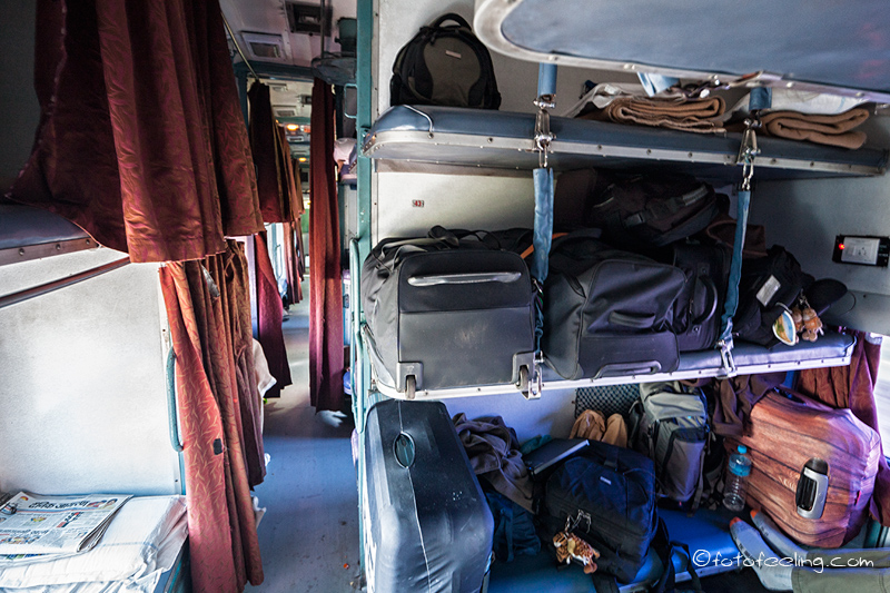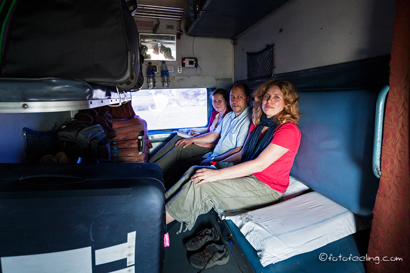 Die Verpflegung im Zug war super. Zuerst bekamen wir jeder eine Flasche Mineralwasser, dann gab es eine kleine Zwischenmahlzeit und später ein richtiges Abendessen, auf das wir aber verzichteten, da wir nach dem Snack schon satt waren. Anderen Passagieren schmeckte das Essen wohl recht gut, denn schon bald erklangen laute Rülpser durch den Waggon. Das ist in Indien ganz normal, aber auf uns wirkte es etwas komisch und nur mit Mühe konnten wir ein lautes Auflachen unterdrücken. Schmunzelnd sagten wir, dass es ja schon prima sei, dass niemand auf den Boden spuckt, denn auch das ist in Indien völlig normal. In einem Reiseführer las ich, dass man schon ein besonders gutes Karma braucht, wenn man durch Indien reist und nicht aus Versehen angespuckt wird. Tja, da hatten wir wohl Glück, denn keiner von uns Vieren wurde bis zum Ende der Reise von Spucke erwischt, auch wenn es oftmals recht knapp war.