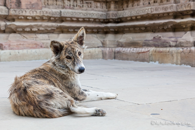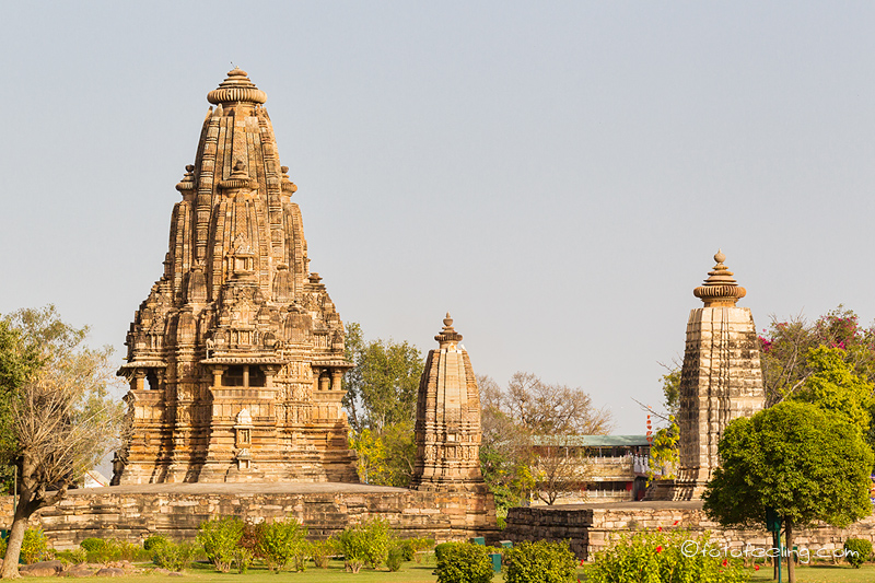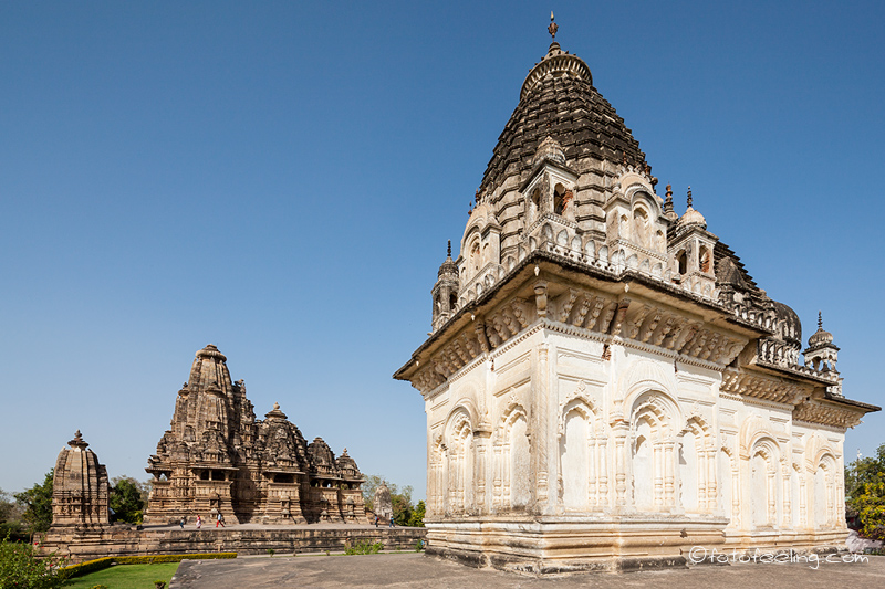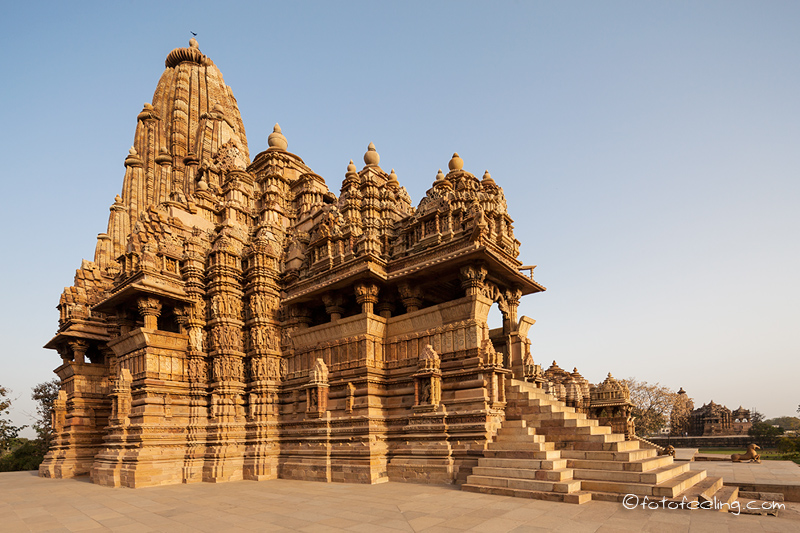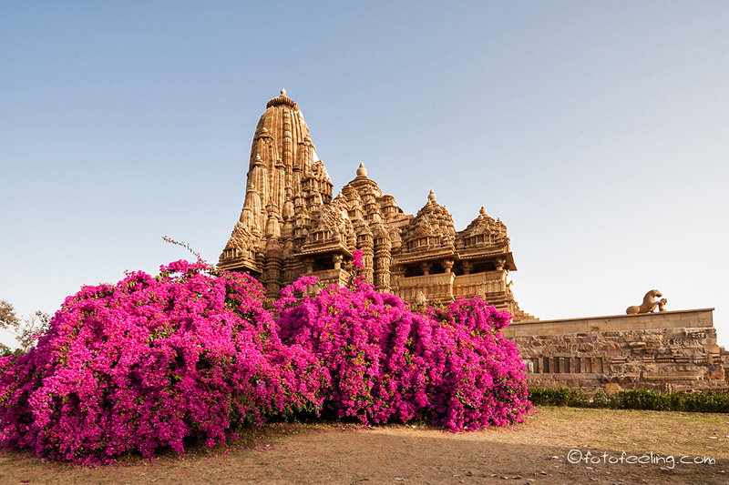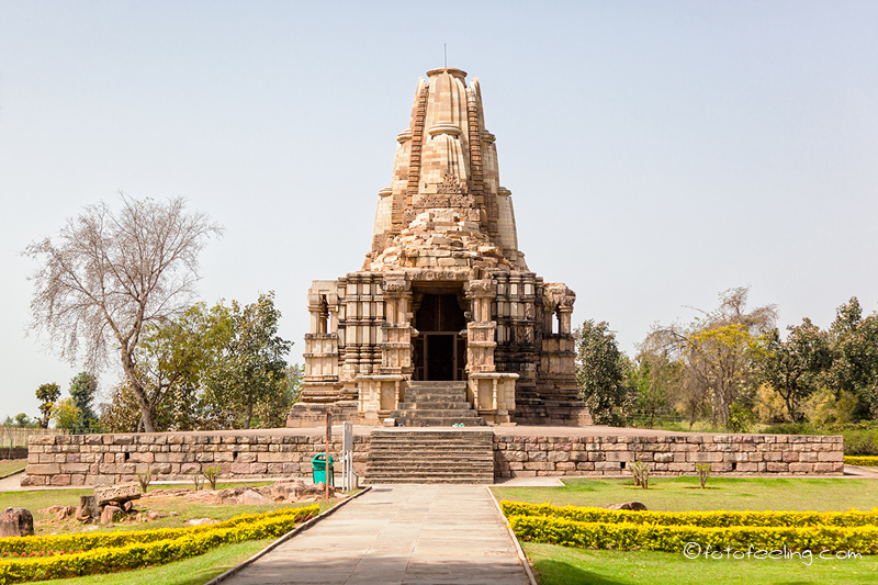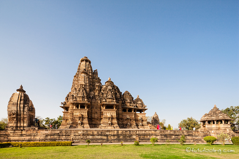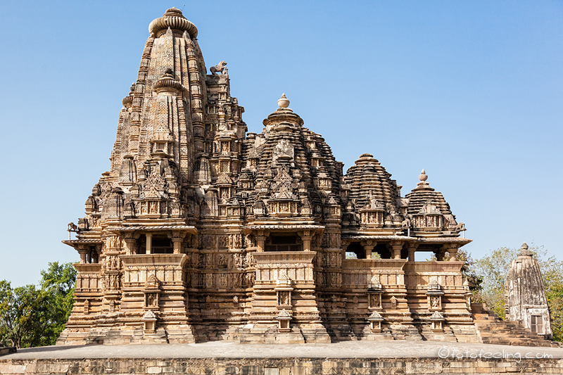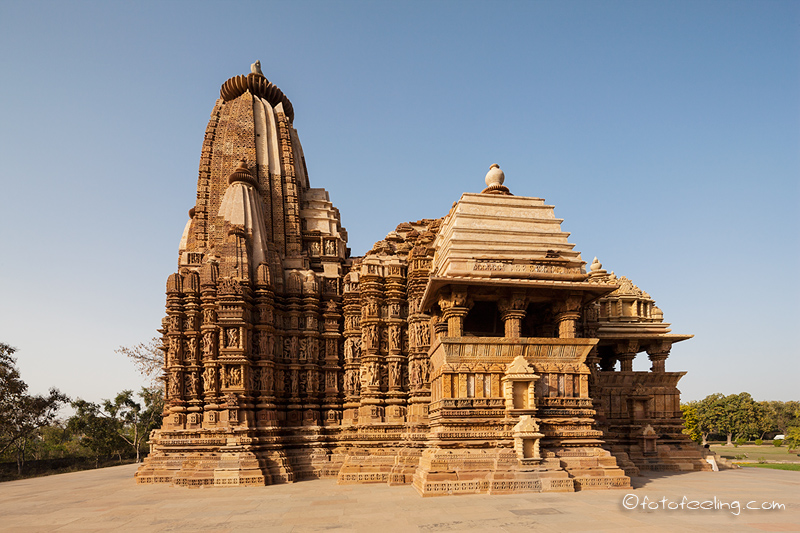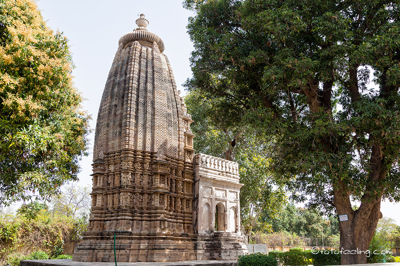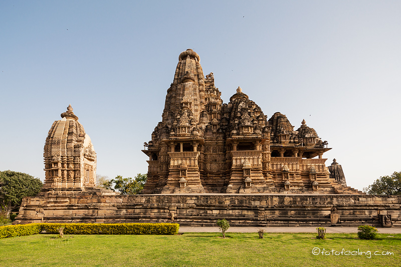 Den ersten wirklich großen Tempelbau der Chandella Dynastie, den Lakshmana-Tempel, der ca. 930-950 n. Chr. erbaut wurde und dem Gott Vishnu als ‚Herrn des Paradieses’ geweiht wurde, musste ich dann fast alleine besichtigen. Chris setzte sich lieber in den Schatten der Vorhalle und ruhte etwas aus. Dieser Tempel war damals der größte Tempel in ganz Indien. In den Ecken der Plattform stehen vier Begleitschreine und vervollständigen das Bild einer kompletten nordindischen Tempelanlage. Auch dieser Tempel war wieder komplett aus Sandstein und ca. 20 m hoch.