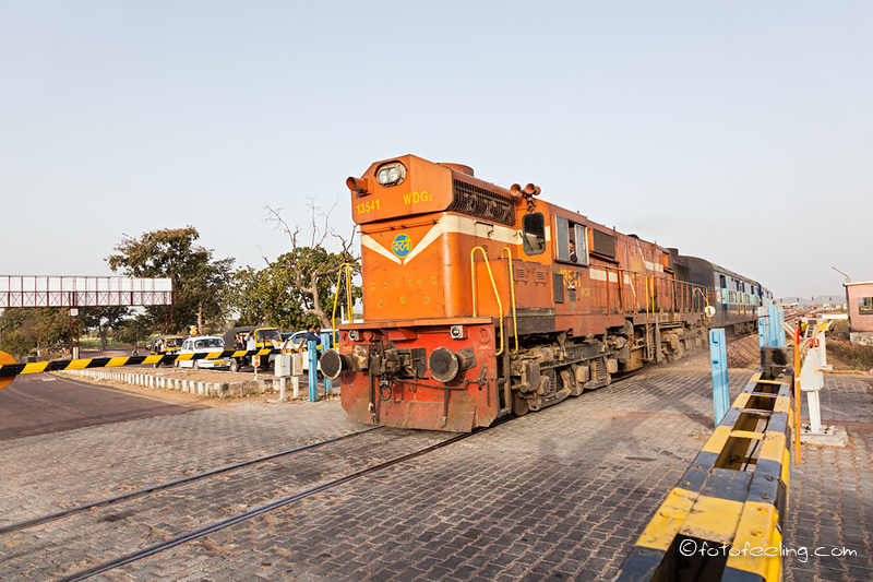 Kurz hinter Khajuraho standen wir mal wieder an einem Bahnübergang, doch diesmal waren wir fast alleine und konnten uns direkt an die Schranken stellen, um den Zug vorbeifahren zu sehen. Er kam, fuhr bis zu den Schranken und blieb genau vor uns stehen. Verwundert schauten wir uns an, dann stiegen auch noch Leute aus, bepackt mit zig Kisten und Koffern. Das sah fast nach einem Umzug aus. Als alles den Zug verlassen hatte, fuhr der Zug rückwärts und wir konnten den Bahnübergang passieren. Das nenn ich mal Service, ein ganzer Zug hält an der Straße, damit ein paar Menschen nicht so viele Umstände haben und ihre Sachen problemlos in ein Auto oder ähnliches schaffen können.