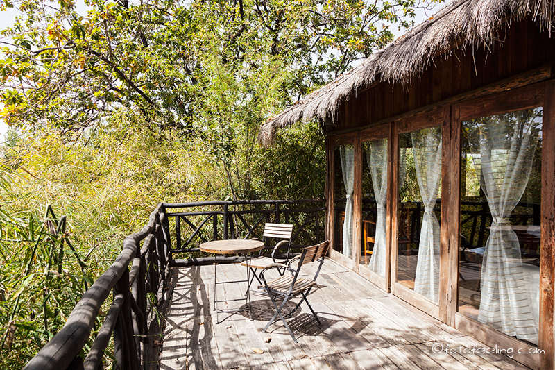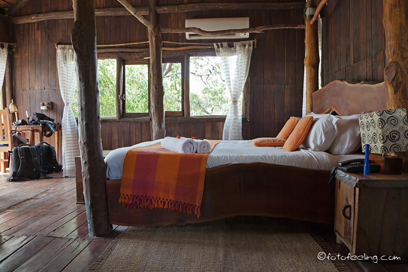 Begrüßt wurden wir von Erwin, dem Manager der Lodge, einem Holländer, der schon in Südafrika eine Lodge geleitet hatte. Er manage die Lodge seit ca. einem Jahr und habe seitdem einige Umbauten vornehmen lassen. So gestaltete er die die Rezeption mit dem Essbereich und die Bar im oberen Bereich neu und nicht umsonst hatte sie einen starken südafrikanischen Touch. Es war einfach toll hier und wir fühlten uns gleich wohl. Erwin begleitete uns zu unseren Häusern, deren Eingang man über eine Treppe erklimmen musste. Wow, der Bungalow war einfach nur toll - liebevoll gestaltet und eingerichtet. Hier gab es alles was das Herz begehrt, nebst einem tollen Balkon mit Liegestühlen und direktem Blick in die Baumkronen bzw. dichten Bambussträucher. Vögel schwirrten umher, es zwitscherte und summte. Mehrere Raben wohnten wohl hier, denn sie saßen auf unserer Treppe und glucksten uns an. Alles war geräumig und offen. In der Mitte des Raums stand ein riesiges Bett, mit Kissen bestückt. Eine Couch lud zum verweilen ein und ein kleiner Schreibtisch stand für unseren PC bereit. Erwin warnte uns, ja nichts liegen zu lassen, denn für ein Mäuschen waren die Holzwände voller Astlöcher und Ritzen kein Hindernis. Selbst ein Kühlschrank und eine Klimaanlage fehlten nicht zu unserem Glück.