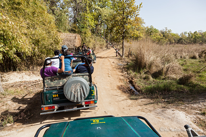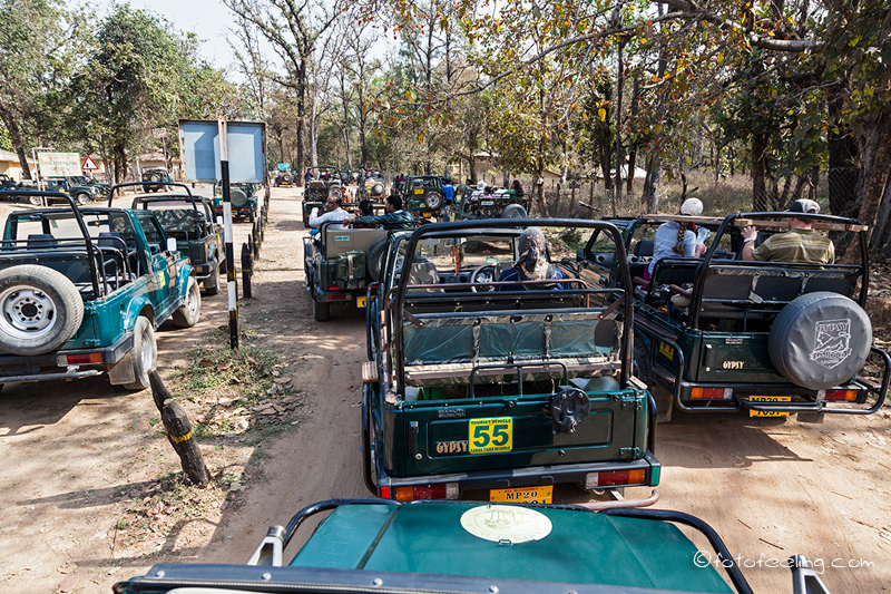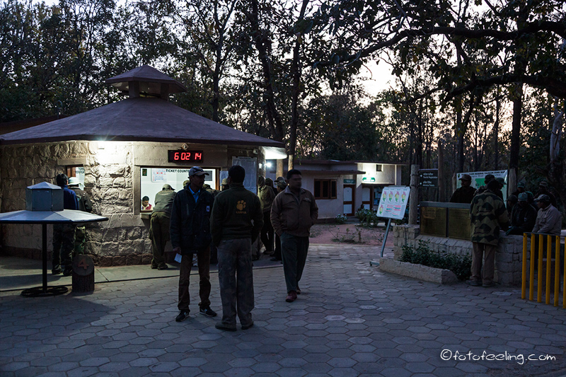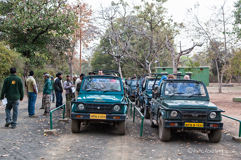In den Kanha Nationalpark führen zwei Eingänge, die in den Dörfern Khatia und Mukki liegen. Unser Weg führte zum Khatia Gate. Dort standen wir jedoch erst einmal mit zig anderen Jeeps in einer langen Schlange und warteten auf die Toröffnung um 6.15 Uhr.