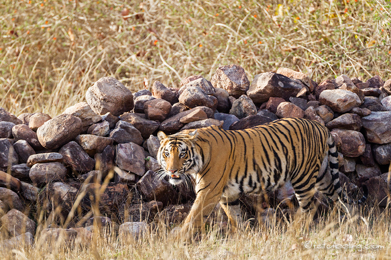 Nach dieser witzigen Begegnung kroch die Zeit langsam dahin und es war sehr warm. Jetzt kommt der Tiger gleich zum Trinken, sagte unser Guide. Ja nee, ist klar – jetzt springt gleich der Tiger aus dem Busch und winkt uns zu… Doch dann tat sich was in dem dichten Buschgewirr und Warnrufe der Hirsche erklangen. Ein heilloses Durcheinander von anfahrenden Jeeps begann, denn jeder wollte seine Touris möglichst perfekt platzieren. Da schlug schon mal Metall aufeinander und es dauerte etwas bis sich das Metallknäuel zu dem wir auch gehörten entwirrt hatte. Endlich hatte jeder seinen Platz eingenommen und alle starrten in die Büsche. Dann hörten wir es deutlich knacken und ein orange-schwarzer Fellfleck wurde sichtbar. Wir trauten unseren Augen kaum, als aus den Büschen ein prächtiges Tigermännchen kam und anfangs genau auf uns zusteuerte. Er blieb stehen und schaute sich die Automassen aus 40 Jeeps etwas genauer an. Alle Kameras liefen auf Hochtouren, nun war kein Wort mehr zu hören. Ich glaube, neben uns hatten einige andere auch das Atmen vergessen so überwältigend war der Anblick dieser bildschönen Katze aus der Nähe.
