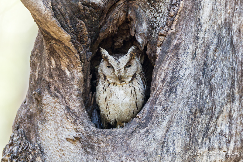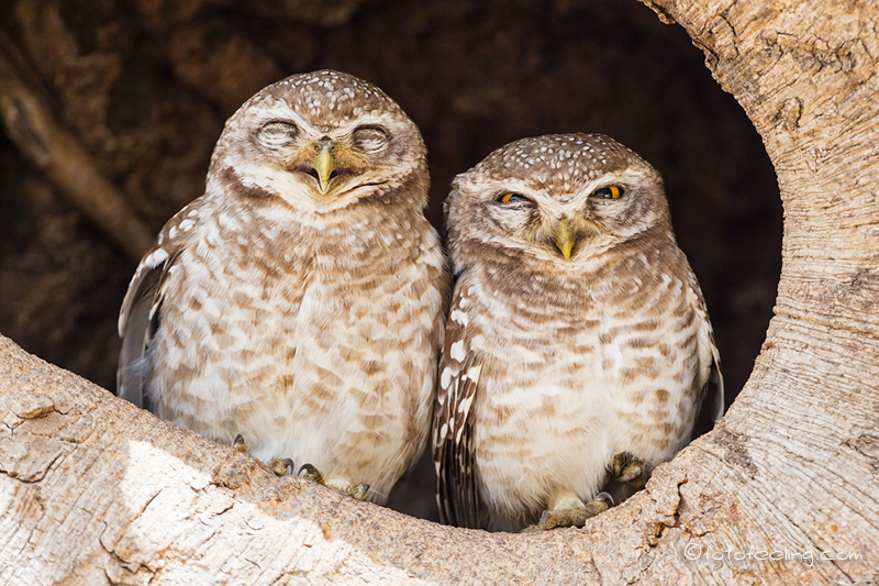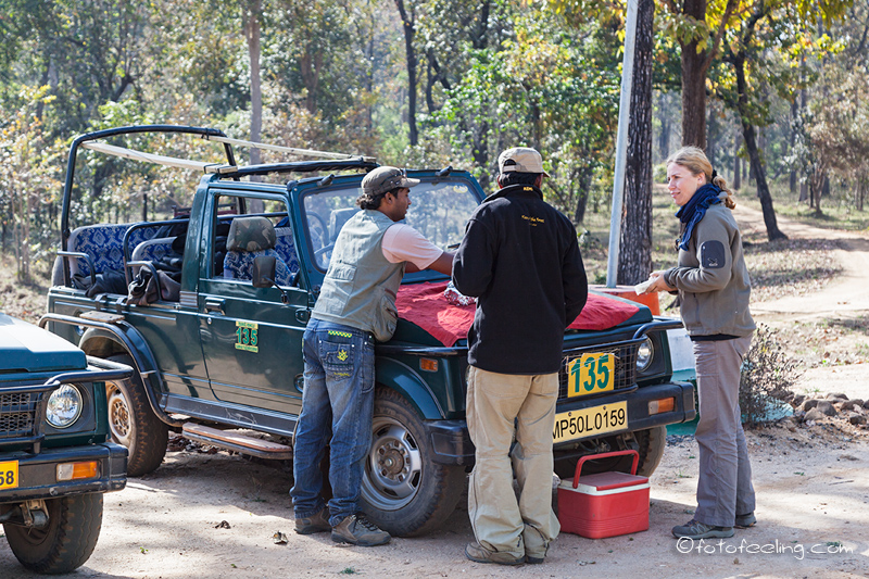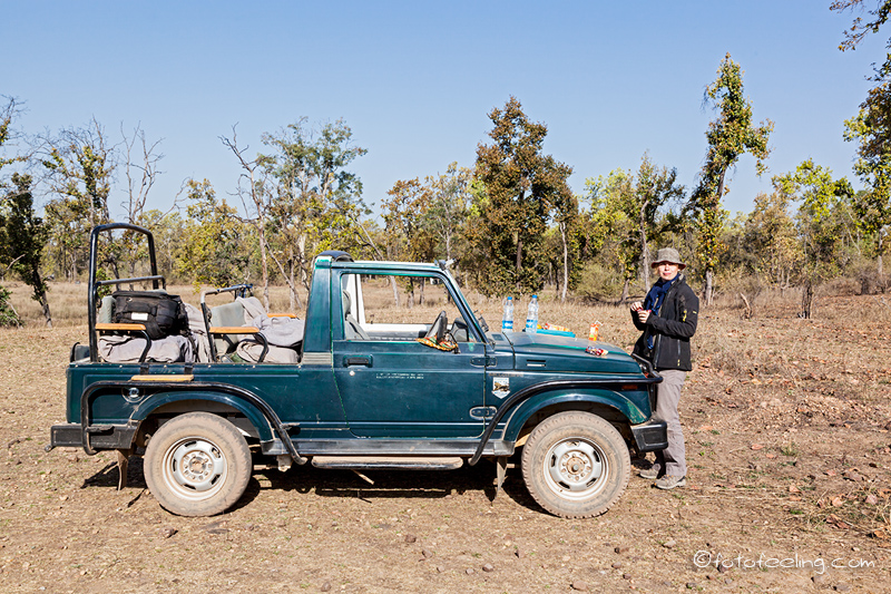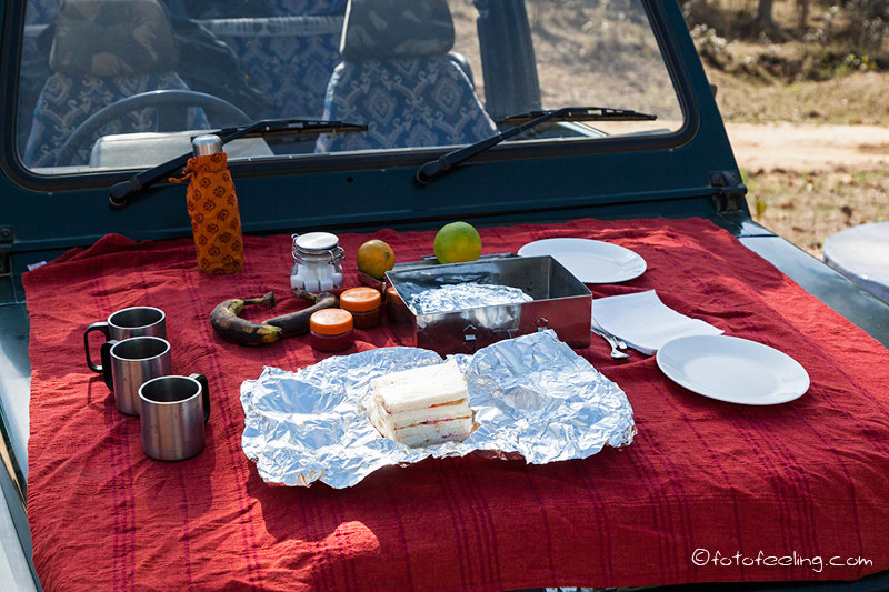 Die Dunkelheit wich der Dämmerung und so langsam wurde es hell. Dann ging es los. Die Schranke wurde geöffnet und ein Guide sprang aufs Auto. Eigentlich hätten die Guides hinten sitzen müssen, aber durch unsere Fotoausrüstung hatten wir nur sehr wenig Platz im Jeep und so setzten sich die Guides nach vorne neben den Fahrer. Über eine Pufferzone kamen wir zum Kisli Gate im Inneren des Parks. Hier wurde noch einmal der Jeep registriert und dann waren wir endlich im Park. Leichter Morgennebel lag über der weiten Graslandschaft und unser Atem dampfte in der Kälte des Morgens. Wir kuschelten uns noch etwas fester in die Decken. Doch trotz der Kälte bestaunten wir fasziniert die Landschaft. An einem großen Baum hielten wir an. Hier hatte eine Brahma-Kauz-Familie ihr Nest und ein kleiner Kauz saß im Astloch und schaute müde auf uns hinab. Ein zweiter gesellte sich dazu. Die waren richtig nett anzuschauen. Unser Fahrer erzählte uns, dass er einmal das Glück hatte bis zu 6 Käuze in dem Astloch zu sehen. Kurze Zeit später ging es weiter, denn der frühe Morgen ist die beste Zeit, um einen Tiger zu entdecken. Schon sichtete unser Guide die ersten frischen Tigerspuren auf dem sandigen Boden, denen wir langsam folgten. Plötzlich erklangen Warnrufe der Axishirsche aus dem dichten Wald und gespannt lauschten wir. Die Warnrufe waren sehr nah, aber so richtig glaubten wir nicht an eine Tigersichtung, als auf einmal ein lautes Brüllen aus den Büschen erklang. Unser Guide vermutete zuerst einen Kampf zwischen zwei männlichen Tigern und wir warteten gebannt, als wie aus dem Nichts eine Tigerin auf den Weg sprang. Sie ließ sich gar nicht von uns stören und wanderte unbeirrt den Weg entlang. Nur ein einziges Mal schaute sie kurz zur Seite, dann ging sie weiter bis sie in dem undurchdringlichen Dickicht des Waldes verschwand. Wir schauten nach dem Tigermännchen, das noch irgendwo im Wald war, aber der Herr hatte keine Lust herauszukommen und so fuhren wir langsam weiter. Nach dieser aufregenden Sichtung gab es erst einmal an einer ausgewiesenen Picknickstelle Frühstück, das aus leckeren, mit Kartoffeln gefüllten Pfannkuchen, belegten Toastbroten, Obst, Saft, Kuchen, Tee und Kaffee bestand. Dazu legte unser Fahrer eine Decke über die Motorhaube des Jeeps und breitete die Leckereien darauf aus. Jetzt merkten wir erst, wie hungrig wir waren und wie gut das Frühstück schmeckte.