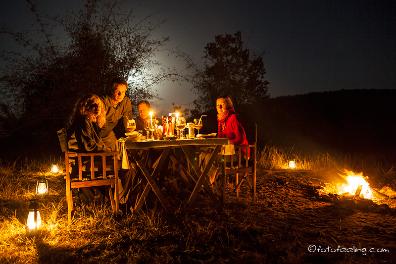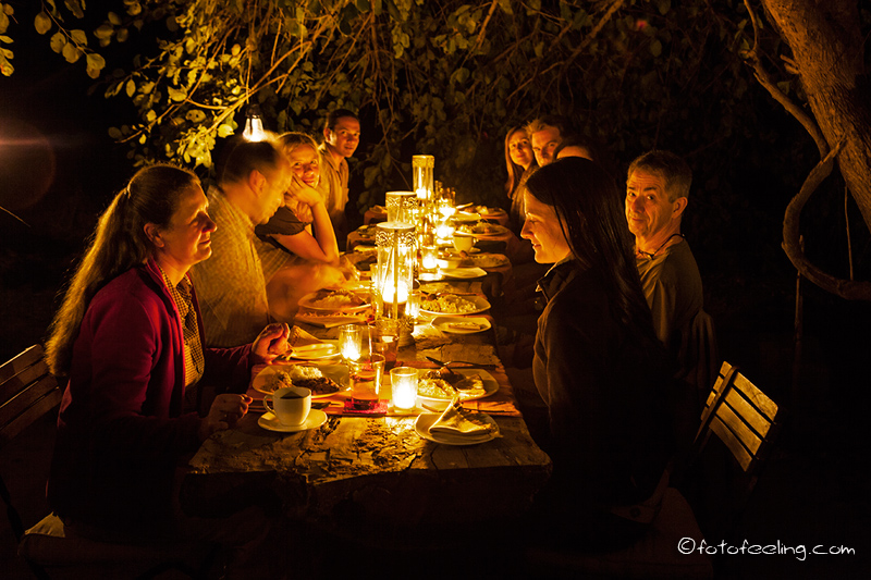 Um 18.30 Uhr waren wir zurück in der Lodge und hatten noch eine Stunde Zeit, ehe es zum Abendessen ging. Am Feuer wurden wieder leckere Snacks gereicht und die Suppe serviert. Das Essen begeisterte uns aufs Neue. Der Koch verstand wirklich sein Handwerk. An diesem Abend gingen wir früh ins Bett, denn der Tag war anstrengend und lang und am nächsten Morgen würde der Weckdienst schon wieder um 4.45 Uhr an unserer Tür klopfen.