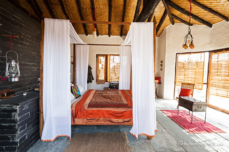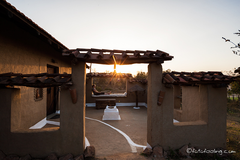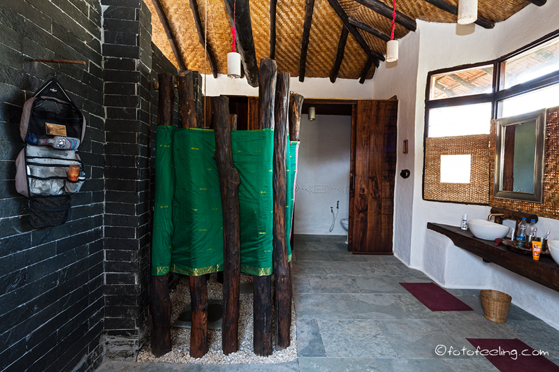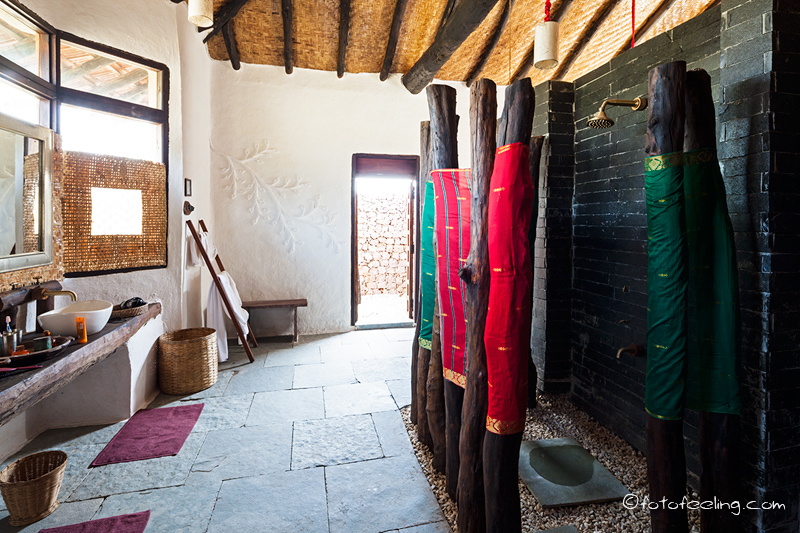 Nachdem wir uns umgeschaut hatten, führte uns Karan zu unseren Zimmern, von denen es nur vier gibt. Unser Bungalow war der letzte in der Reihe. Wir staunten nicht schlecht, als wir ihn sahen und betraten. Das Haus war absolut perfekt und liebevoll gestaltet und auf traditionelle Weise von außen mit Kuhmist verputzt und innen wunderschön eingerichtet. Ein riesiges Bett steht in der Raummitte, Sitzgelegenheiten und Schreibplätze sorgen für eine Wohlfühlatmosphäre. Überall stehen Kerzen, Bilder hängen an den Wänden und eine große Terrasse, die mit einem Sonnensegel überspannt ist, lädt zum Verweilen ein. Die Dusche ist super, nur mit geschwärzten Pfählen und Saris als Sichtschutz, aber das Beste ist die Außendusche, die als kleiner Wasserfall über die Steine sprudelt. Als Karan sie uns zeigte, suchten wir anfangs vergeblich nach den Wasserhähnen und dem Duschkopf, die perfekt in die Natursteine eingearbeitet sind. Einfach nur klasse hier! Neben unserem Häuschen steht ein riesiges Bett, das mit einem Baldachin überzogen ist und so Schutz vor der intensiven Sonne bietet. Darauf liegen zig Kissen und an den Seiten hängen Stoffe, die im Wind wehen. So kamen wir uns ein wenig wie ein Prinzenpaar aus einem Märchen vor. Hier würden wir die restlichen Urlaubstage verbringen.
