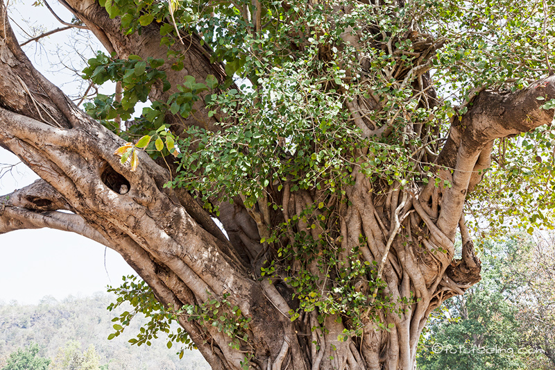 Eigentlich wäre an diesem Morgen keine Safari mehr gewesen, aber da der Transfer zum Kanha Nationalpark nur ca. 5-6 Stunden dauern sollte, organisierte uns Erwin eine letzte Safari. Noch einmal sollten wir die Chance bekommen einen Tiger zu entdecken. Unser Fahrer war gleich organisiert und auch unser Guide freut sich auf eine letzte Chance. Schon ging es los. Ich weiß nicht, wie viel Kilometer wir an diesem Morgen zurücklegten. Wir sahen einige neue Abschnitte des Parks, fragten Waldarbeiter nach Tigern, beobachteten Gaur (Indische Bisons), die bald ausgewildert werden sollten, sahen Hirsche und Affen, eine Racke posierte toll auf einem Halm, aber nirgendwo war eine Katze zu entdecken. Dafür zeigte uns unser Guide noch einen Tigerkratzbaum, an dem deutlich bis in fast 2 Meter Höhe Kratzspuren zu sehen waren.