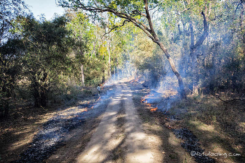 Die Nachmittagstouren verliefen ähnlich wie die Vormittagstouren, nur dass sich die Spannung auf eine Tigersichtung im Laufe des Nachmittags steigerte. Leider war uns das Glück nicht mehr hold und wir mussten uns mit der einen Sichtung begnügen. Beklagen können wir uns trotzdem nicht, denn der Park war einfach genial. Interessant waren auch die vielen Waldarbeiter, die aus forsttechnischen Gründen an den Wegen kleinere Waldbrände legten und sie unter Kontrolle hielten (Feuerschneisen, um Waldbrände zu verhindern). Unser Fahrer fragte immer wieder nach Tigern, aber niemand hatte etwas gehört oder gesehen. Einmal verfehlten wir einen Tiger um Haaresbreite, etliche andere Autos hatten ihn entdeckt und konnten ihm etwas folgen, doch zu dem Zeitpunkt waren wir gerade woanders im Park unterwegs und genau diese Strecke auf der sich der Tiger bewegte, hatten wir kurz vorher zurückgelegt.