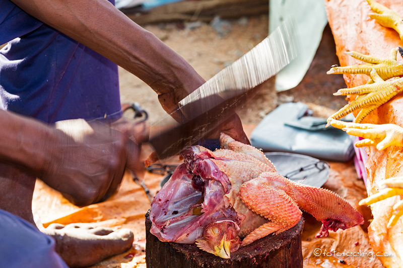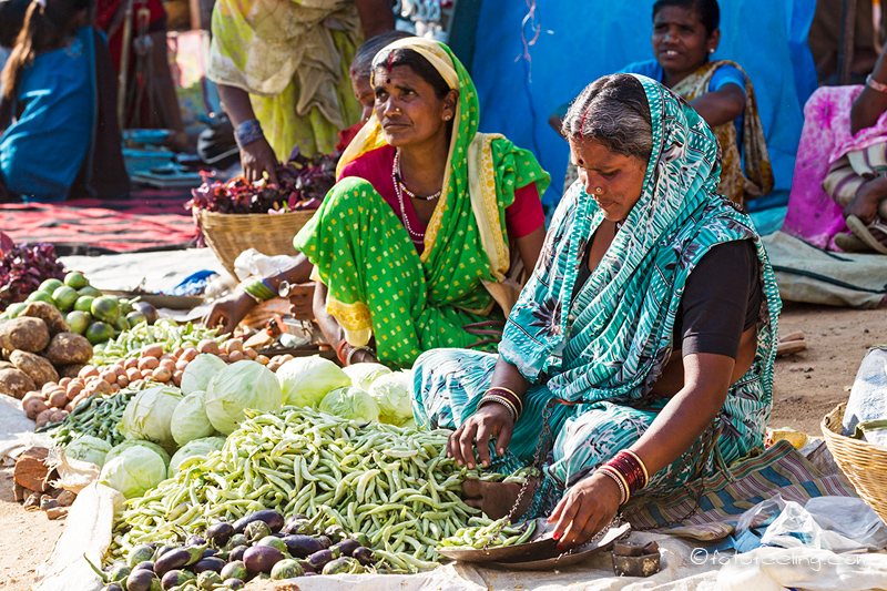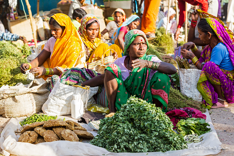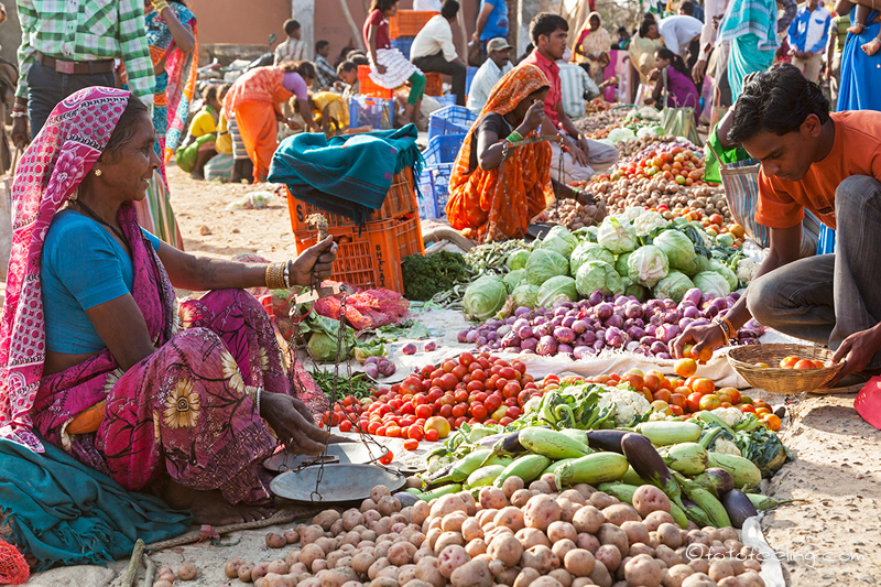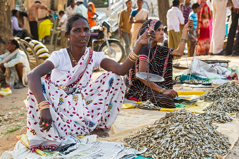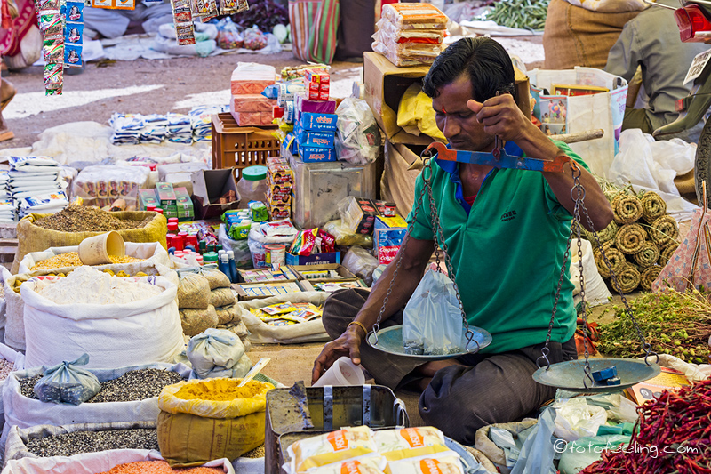 Am Mittwochnachmittag war wie in allen anderen Parks der Kanha Nationalpark geschlossen. Als Ersatz organisierte Isa für uns einen Marktbesuch in dem kleinen Dörfchen Mocha; Karan und sie begleiteten uns und erzählten uns viel über die einheimischen Gemüsesorten, Gewürze und Lebensmittel. Die Verkäufer waren meist sehr einfache Menschen und sehr nett. Immer wieder fragten wir, ob wir Bilder machen dürften. Unsere Bitte wurde nur selten abgelehnt, meist dann, wenn derjenige unter Alkohol stand, was leider auch in Indien ein Problem ist. Besonders die Fisch- und die Fleischverkäufer hatten es uns angetan. Sie waren sichtlich stolz auf ihre Ware und posierten gerne vor der Kamera. Es tat uns zwar irgendwie leid, dass die Hühner gerade noch lebten und vor unseren Augen ausgeblutet, gerupft und zerlegt wurden, aber dafür war die Ware sehr frisch und es war interessant, den ganzen Ablauf zu beobachten. Die Fische stammten aus den großen Flüssen und waren auch dementsprechend frisch. Nichts stank gammlig, alles sah sehr ordentlich aus.