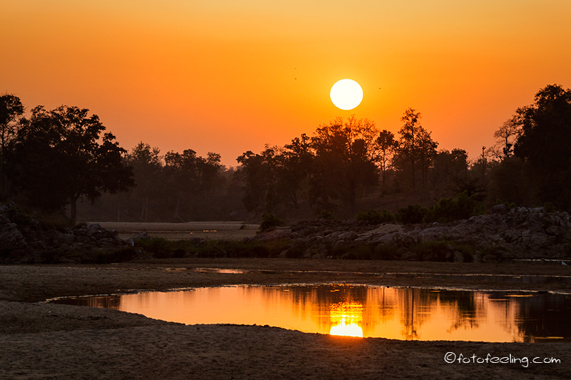 Wir fuhren lange durch den Park und lauschten immer wieder nach Warnrufen der Hirsche. Nichts. Dafür sahen wir ein paar Hirsche und Vögel. Als wir schon nicht mehr an eine Tigerbegegnung glaubten, erklangen irgendwo weit weg Warnrufe. Unser Naturführer beratschlagte sich mit dem Guide und wir brausten los. Immer wieder hielten wir an und horchten in den Wald, dann kamen wir zu einer Stelle, an der schon andere Autos standen und warteten. Sie hatten bisher auch nur die Warnrufe vernommen und festgestellt, dass es sich um zwei paarungswillige Tiger handeln muss. Dann erklang ein Brüllen. Wir fuhren weiter und gelangten an das andere Ende des Waldes. Eigentlich unglaublich, dass die Tiger so gut getarnt sind, denn wir sahen nichts, auch nicht als unser Guide schon wie wild gestikulierte. Wo bitte soll denn da ein Tiger sein, unter dem Baum dort??? Dann sah auch ich sie - zwei Tiger im Liebestaumel bewegten sich durch die Büsche, doch leider bis auf eine ganz kurze Kopfsichtung blieb es bei ein paar Fellfetzen. Dafür waren sie wieder einmal gut zu hören. Wir warteten so lange bis wir aus dem Park mussten, dann fuhren wir als eines der letzten Autos in Richtung Gate. In der Lodge erfuhren wir von Kerstin und Uwe, dass sie am Morgen in Zone 1 eine Tigershow hatten, das heißt, dass sie vom Elefantenrücken aus zu gesichteten Tigern gebracht wurden. So konnten sie eine Tigerin mit ihren drei Jungen beobachten. Wir sollten dafür am Nachmittag in Zone 1, da würden aber keine Elefantenritte zu den Tigern stattfinden, da sie nur in der Früh wären. Wir waren maßlos enttäuscht. Ich hätte mir nichts mehr gewünscht als die Tigerin mit ihren Jungen sehen zu können, aber leider war uns das nicht vergönnt. Am Nachmittag war die Tigerfamilie längst weiter gewandert. Unser Fahrer und unser Guide versuchten wirklich alles, um uns noch einen Tiger zu zeigen, aber vergebens. Bis auf ein paar Fledermäuse in einer alten Höhle, sahen wir ‚nur‘ ein paar Axis- und Sambar Hirsche, sowie zwei Mungos, die geschäftig davonhuschten. Dafür fuhren wir durch eine wahnsinnig schöne Landschaft. Über Serpentinen ging es steil den Berg hinauf und dann wieder sanft hinab, wir querten Flüsschen, sahen die alte Festung hoch oben auf den Felsen, fuhren durch Ebenen mit Weideland und vielen Seen und achteten sehr auf das Verhalten der Hirsche. Nichts. An einem Wasserloch wurde es noch einmal etwas spannend, als ein Warnruf erklang, aber leider tat sich nichts. Trotzdem war es ein schöner Nachmittag, der mit einem noch schöneren Abend endete. Denn an diesem Abend waren wir die einzigen Gäste der Lodge. So hatte sich das Personal alle Mühe gegeben und uns am Wasserloch ein Candle-Light-Dinner gezaubert. Zuerst mussten wir den Lichtern folgen und über ein paar Felsen klettern, dann kamen wir zu einem perfekt gedeckten Tisch auf dem die Kerzen im Mondlicht funkelten. Es war sehr hell, denn der Vollmond beleuchtete die Landschaft um uns herum. Wir fühlten uns wie die Könige und wurden auch so verwöhnt. Sehr zufrieden gingen wir ins Bett.