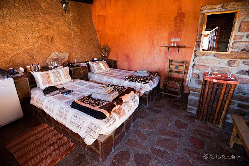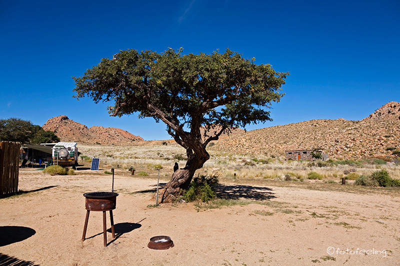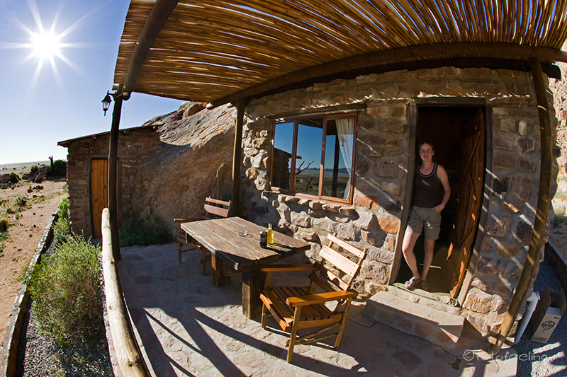 Wir besuchten die Wildpferde in „Garub“ im Mai 2008 zum ersten Mal richtig, den sonst haben wir die Wildpferde immer nur im Vorbeifahren gesehen. Dazu übernachteten wir in Klein Aus Vista. Eigentlich wollten wir einen Stellplatz auf der Campsite, aber es war nichts mehr frei. Einzig ein Bungalow im Eagles Nest wäre noch frei, sagte uns die nette Dame von der Rezeption. Wir entschieden uns für den Bungalow und bereuten keinen Cent. Der Bungalow war einfach ein Traum. Ein hübscher Naturstein-Bungalow mit einer netten Terrasse, Dusche und Toilette, perfekt in die Felsenlandschaft eingebaut. Der Blick konnte frei über die Landschaft schweifen und kein anderer Bungalow nahm einem die Sicht. So hatte man fast das Gefühl alleine zu sein. Dazu ein dampfender Kaffee und schon ist der Tag perfekt.