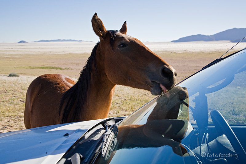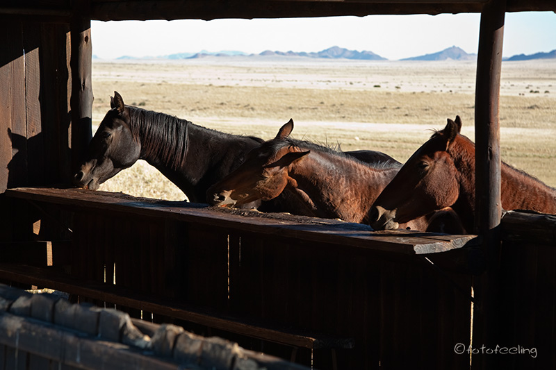 Die Wildpferde haben hier die einzige permanente Wasserquelle in der Namib und kommen relativ verlässlich dorthin. Diese außergewöhnlichen Tiere haben sich perfekt an das Leben in der Wüste angepasst, so kommen sie ca. 6 Tage ohne Wasser aus, während normale Pferde nach drei Tagen trinken müssen. Niemand weiß so genau, wo die Pferde eigentlich herstammen. So gibt es einige interessante Theorien.