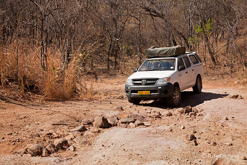 Die Strecke führt zuerst durch viele kleine Dörfer. Hier kamen uns scharenweise Menschen zu Fuß, auf Eselskarren und auf Fahrrädern entgegen. Je weiter wir uns von der Zivilisation entfernten, desto freundlicher wurden die Leute. Generell können wir behaupten, dass die Menschen in Sambia für uns die freundlichsten, nettesten und am wenigsten aufdringlichen Menschen auf unseren Reisen in Afrika sind. Die ersten 60 km von Petauke aus, war die Piste recht gut, dann wurde die Strecke bergiger und die Dörfer weniger. Auf der Strecke durchquerten wir einige Trockenflüsse, zu denen es steil bergab und auf der anderen Seite wieder steil bergauf ging. Dabei mussten wir zum Teil große Steine von der Straße schleppen oder tiefe Risse mit Steinen auffüllen. Das ein oder andere Mal setzten unsere Autos dabei an unwegsamen Passagen auf, zum Glück ohne Schaden zu nehmen.