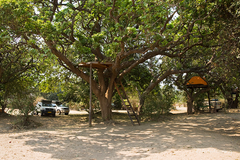 Flatdog Camps (Flatdog = Krokodil). Das Besondere an dem Camp sind große Holz-Plattformen in den Bäumen, auf denen man sein Zelt aufbauen kann. Es gibt zahlreiche Schattenbäume mit Grillstellen, Wasser, Strom und Sitzmöglichkeiten. Der Campingplatz liegt ca. 100 m vom flachen Ufer des Luangwa Flusses entfernt, auf den man eine schöne Aussicht hat. Saubere Duschen und Toiletten sind vorhanden. Einzig, die große Beliebtheit des Campingplatzes kann etwas nervig sein, denn er wird auch von vielen Campern und Overlandern angefahren und so kann es mitunter etwas lauter und enger werden. Das Restaurant, der Pool und auch die Bar kann von allen Besuchern benutzt werden. Ein Internetcafe ist auch vorhanden.