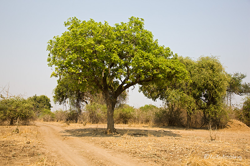 Der Park ist landschaftlich sehr abwechslungsreich, so hat man den Luangwa Fluss mit seinen Sandbänken, offene Grasflächen, Buschgebiete und Laubwälder. Sehr häufig sieht man die imposanten Leberwurstbäume, die zu unserer Reisezeit über und über voll mit ihren mächtigen Früchten waren. Ansonsten findet man hier auch Palmen, Baobabs, Leadwood- und Mahagonibäume.