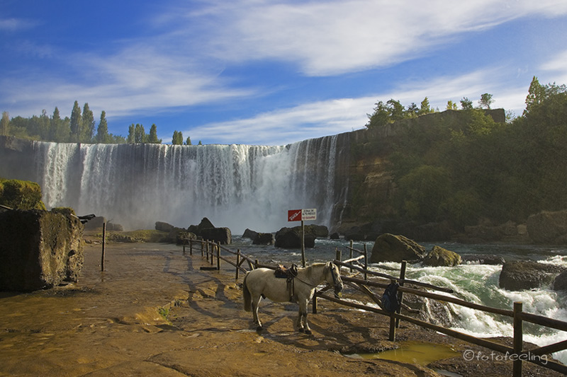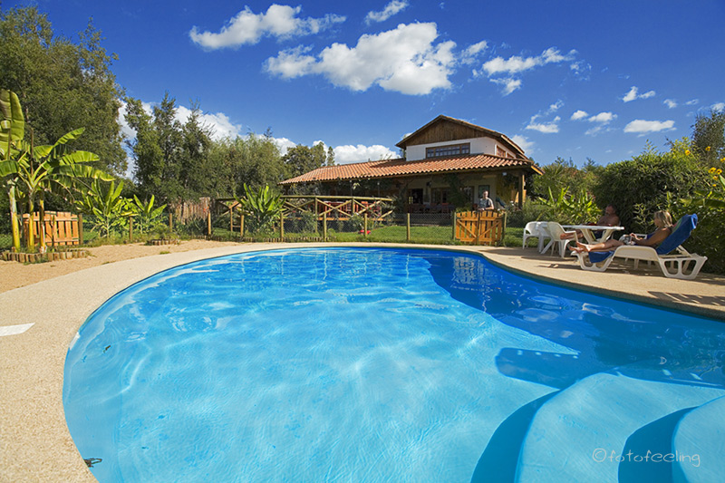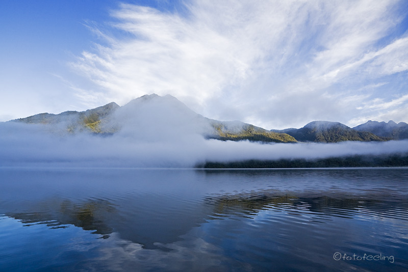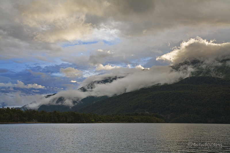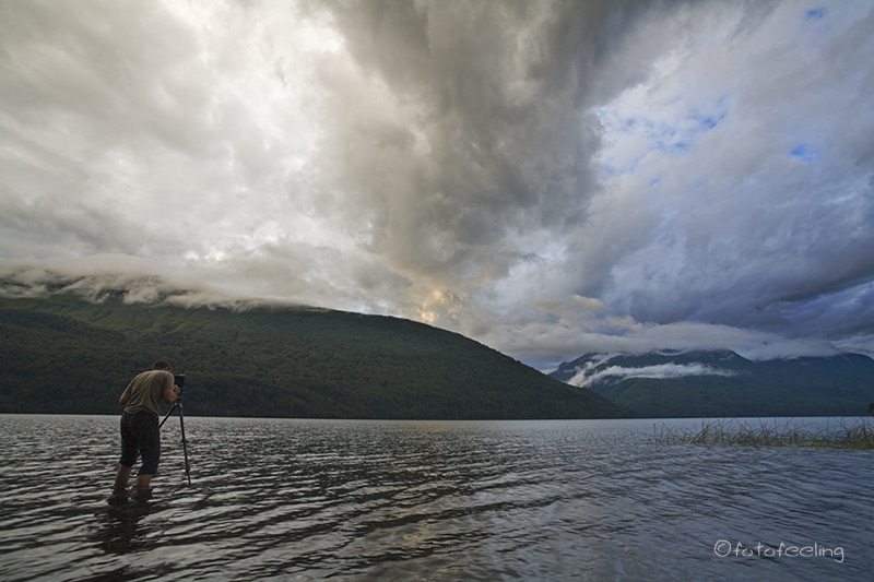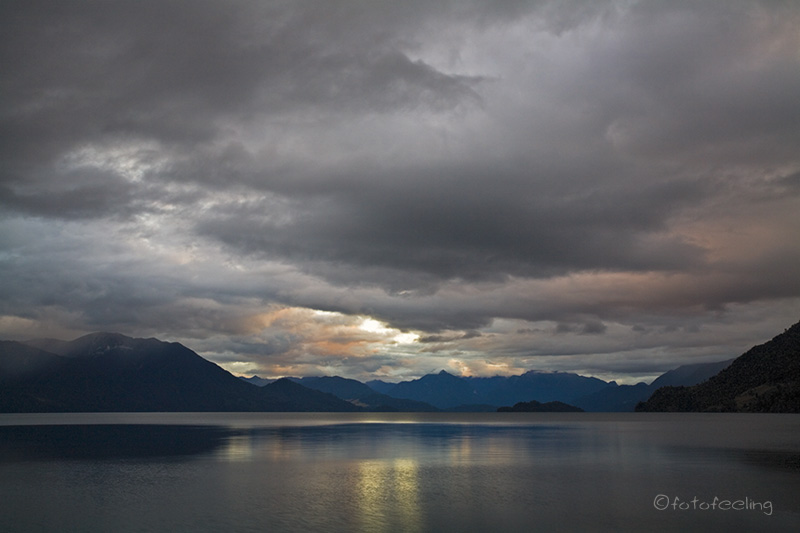 Ich konnte mich kaum losreißen und so ging Chris schon mal zum Auto und machte uns ein leckeres Frühstück, das wir beide so richtig zufrieden genossen. Danach fuhren wir weiter Richtung Süden. Immer wieder nahm Hochnebel uns die Sicht und tauchte die Landschaft in eine fast schon mystische Stimmung. Im Laufe der Zeit setzte sich immer mehr die Sonne durch und es wurde ein toller Vormittag. In Puerto Varras bezahlte Chris unsere gebuchte Fähre und dann ging es auch schon weiter in Richtung Saltos de Petrohue. Leider bekamen wir den Vulkan Osorno nicht zusehen. Große schwere Wolken versperrten uns die Sicht und langsam sah es immer mehr nach Regenwetter aus. Egal, die Stimmung war auch so topp und die Sonne kam immer wieder durch die Wolken. So genossen wir die Fahrt entlang des Lago Llanquihue und die saftig grüne Landschaft. Immer wieder tauchten Schilder am Straßenrand mit der Aufschrift „Kuchen“ auf, doch leider war es noch zu früh und wir zu satt, aber alleine das deutsche Wort übte schon fast eine magische Wirkung auf uns aus. Die Straße war bis zu den Saltos de Petrohue geteert, danach führte uns eine Wellblechpiste die letzten sechs km bis zum Lago Todos Los Santos. Die Strecke war jedoch so abwechslungsreich mit immer wieder aufregenden Ausblicken auf den Rio Petrohue, dass wir die schlechte Piste gar nicht mehr als so schlimm empfanden. Der Lago Todos Los Santos liegt 190 m über dem Meeresspiegel, er ist von dichtem Wald umgeben und hat zahlreiche Seitenarme. Es führt keine Straße um den See. Er kann nur mit dem Boot überquert werden und liegt direkt an den Bergen und somit inmitten einer traumhaften Kulisse. Am Lago Todos Los Santos entdeckten wir dann die Campsite der CONAF direkt am See. Sie war so bezaubernd gelegen, dass schon nach kurzer Zeit für uns fest stand, dort die Nacht zu verbringen. Vorher fuhren wir jedoch noch einmal zurück zu den Saltos de Petrohue. Hier fließt der Rio Petrohue in malerischen Kaskaden eine Schlucht hinab. Von dort hat man normalerweise einen tollen Blick auf den Vulkan Osorno, der sich uns leider immer noch nicht zeigen wollte. Wir verbrachten an den Fällen sehr viel Zeit, aber bis auf einen kurzen Blick auf seine Schneespitze sollten wir an diesem Tag kein Glück haben. Es war trotzdem wunderschön. Irgendwann am Spätnachmittag gaben wir die Hoffnung auf und fuhren zurück zum Campingplatz, wo wir uns einen schönen Stellplatz am See aussuchten. Chris kaufte noch ein paar Würste von einem Chilenen, der sie am Strand von seinem Auto aus anbot. Später kochten wir die Würste, die unseren Polnischen sehr ähnlich waren und lecker schmeckten. Zu festen Zeiten gab es warmes Wasser in den Duschen, was wir beide nach diesem wolkenverhangenen Tag so richtig genossen. Die Wolken waren leider auch am Abend so dicht, dass es keinen farbenfrohen Sonnenuntergang gab. Der Blick auf den See war aber auch so traumhaft und die Stimmung richtig urlaubsmäßig. So saßen wir noch lange bei einem Glas Rotwein draußen am Lagerfeuer, schauten auf den See und genossen die Stille. Tageskilometer: Lago Villarrica - Lago Todos los Santos 380 km Übernachtung: Campingplatz der CONAF am Lago Todos Los Santos (7000 Peso) - Chile |