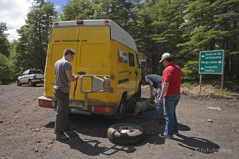 Mit relativ starkem Kopfweh wachten wir beide aus einem mehr (ich) oder weniger (Chris) langen Schlaf auf. Ca. 5.30 Uhr war die Nacht für uns zu Ende, denn heute wollten wir ja etwas weiter kommen. Wir bekamen noch zwei leckere Lunchpakete von der Lodge überreicht, die wir so nach und nach (hungrig) auf der Fahrt verputzten. Über die Panamerikana 5 ging es südwärts, vorbei an in Nebel gehüllten Feldern und Bergen bis zum Salto del Laja, der ungefähr 80 km südlich von Chillan liegt. Er ist ein ca. 100 m breiter Wasserfall, der 40 - 50 m tief in eine Schlucht stürzt. Ein Weg führt direkt zu den Fällen, die man von oben oder unten betrachten kann. Allerdings stand der Wind etwas ungünstig und so mussten wir immer wieder die Linsen unserer Kameras putzen, an denen sich beharrlich feine Wassertropfen festsetzten. Nach einer Stunde Pause an dem Wasserfall ging es wieder weiter. Auf der Panamerikana befinden sich immer wieder Mautstationen, an denen man bezahlen muss. Zum Glück war nur wenig los und es ging relativ schnell. Bei Melipeuco verließen wir die Straße und fuhren in den NP Conguillio, der einer der schönsten NP Chiles sein soll. Im Park befinden sich riesige Bestände an Araucarien Bäumen, die ein wenig an Regenschirme erinnern, zahlreiche Lagunen und im Zentrum befindet sich der Vulkan Llaima (3125 m). Er soll einer der aktivsten Vulkane Chiles sein, aber leider hüllten ihn dichte Wolken fast völlig ein. Die Landschaft war wirklich beeindruckend und auch schon die ersten Araucarien konnten wir auf einem Bergrücken entdecken, als auf einmal unser Auto etwas ausscherte und Chris daraufhin anhielt. Mist - ein Reifen war geplatzt! Kein Problem, dachte sich Chris, denn er kennt sich ja mit dem Reifenwechseln aus. Doch leider klemmte die Hintertür und dahinter befanden sich der Wagenheber und das Werkzeug. Alles Rütteln und sämtliche Aufsperrversuche halfen nichts, die Tür blieb zu. Zum Glück kam gerade ein Pick-up vorbei, aber leider hatte er für unsere Lastwagenreifen nicht das passende Werkzeug dabei. Glücklicherweise sprach die Fahrerin etwas englisch und so konnten wir uns verständigen. Kurz darauf hielt noch ein 4x4 Wagen an, aber auch er konnte uns mit dem richtigen Werkzeug nicht aushelfen, dafür schnappte der Fahrer Chris und fuhr mit ihm zur CONAF. Das ist die Forstbehörde, die die Nationalparks verwaltet. Sie brachten einen Ranger mit dem richtigen Werkzeug mit. Zwischenzeitlich hatte ich immer wieder versucht, die Tür aufzusperren, aber leider ohne Erfolg. Unser Retter wechselte uns sogar noch den Reifen und wollte überhaupt nichts dafür haben. Alle Chilenen blieben bis zum Schluss bei uns. Das war das erste Mal, dass ich es sehr bedauerte, nicht Spanisch zu können und es sollte nicht das letzte Mal gewesen sein. Als unser Auto wieder fahrtüchtig war, wollte Chris keine Risiken mehr eingehen und so verließen wir den Park auf dem gleichen Weg, den wir gekommen waren und fuhren direkt nach villarrica. An einer Tankstelle telefonierten wir erst einmal mit Sebastian von Trekker Chile. Unser Reifen war in villarrica nicht aufzutreiben, aber am 24.02. sollten wir zu einer Pirelliwerkstatt nach Puerto Montt fahren und dort einen neuen Reifen abholen. Nach einiger Zeit versuchte Chris noch einmal die hintere Tür zu öffnen und plötzlich ging sie ohne Probleme auf. Wir konnten es kaum glauben. Chris verstaute erst einmal sämtliches Werkzeug und den Wagenheber im Autoinneren und reinigte dann das Schloss von Staub und Dreck. Zum Schluss gab er noch ein paar Tropfen Olivenöl in das Schloss und die Tür funktionierte wieder – zwar mit einigen Macken, aber dafür bis zum Ende der Reise. ;) Jetzt hatten wir wieder Zeit und Muße und nahmen auch die schöne Umgebung mit dem Vulkan villarrica wahr, der frech mit seiner weißen Spitze aus den Wolken hervor schaute. Besonders schön war die Aussicht auf den Vulkan vom Lago villarrica aus. Was für ein Anblick - faszinierend und wunderschön zugleich! Natürlich mussten wir ihn uns auch noch aus der Nähe anschauen und fuhren relativ dicht an den Vulkan heran. Es war einfach gigantisch, aber die Aussicht vom See hatte uns noch besser gefallen, und so beschlossen wir dort zu übernachten. Die Campsite Playa Blanca war von den Sanitäreinrichtungen mehr als bescheiden, aber das machte die tolle Aussicht und auch das nette Personal wieder wett. Kaum waren wir auf dem Platz, schleppte uns der Platzwart Stühle und einen Tisch an. Als wir später grillen wollten und er unseren mickrigen Grill sah, bekamen wir noch einen tollen großen Grill hingestellt. Der erste Grillgang schmeckte hervorragend unter dem wunderschönen Sternenhimmel, aber im Laufe des Abends kühlte es doch sehr ab und so gingen wir bald ins Auto. Das Bettbauen in unserem „Bully“, so tauften wir unser kompaktes kräftiges Auto, war mit ein paar Handgriffen schnell erledigt und aus den Sitzkissen wurde unsere Matratze. Wir kuschelten uns in unsere Schlafsäcke und schon bald schliefen wir tief und fest nach einem ereignisreichen langen Tag. Tageskilometer: Talca - Lago Villarrica 690km Übernachtung: Playa Blanca am Strand vom Lago Villarrica (10000 Peso) - Chile |