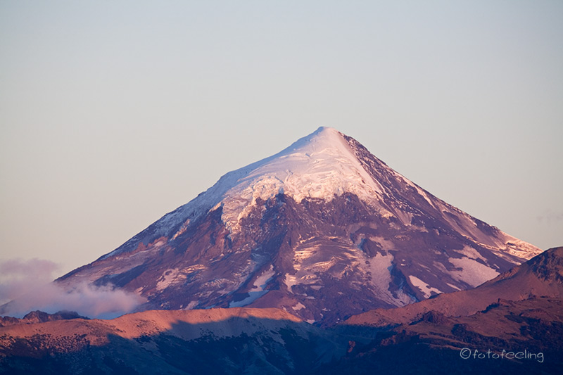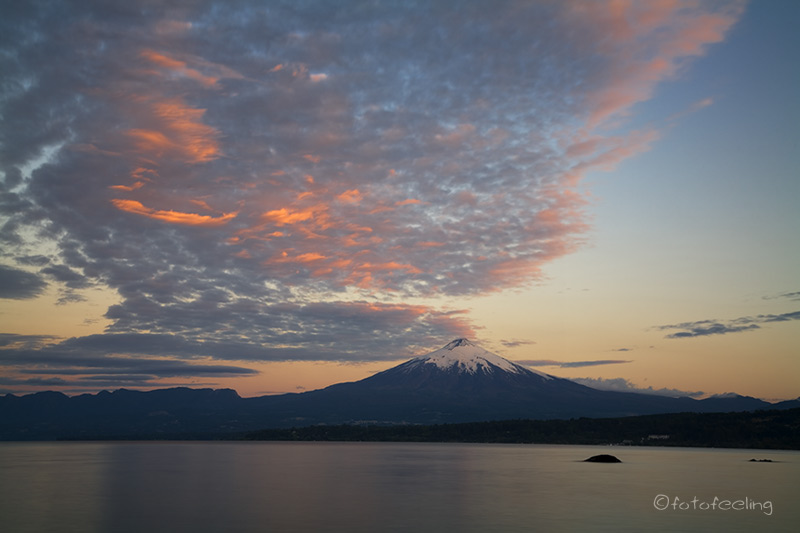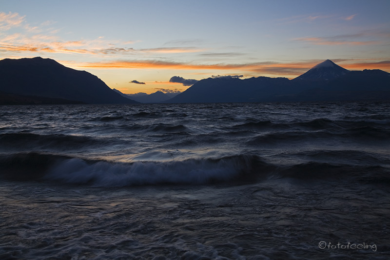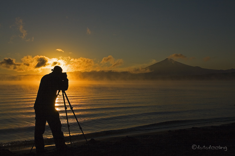 Viel zu früh klingelte uns der Wecker aus dem Schlaf. Sehr müde schauten wir nach draußen. Dort setzte gerade die Dämmerung ein und wir konnten den Vulkan villarrica deutlich und ohne Wolken vor uns sehen. Dementsprechend schnell sprangen wir aus dem Bett, schlüpften in die Klamotten und wollten an den Strand sausen. Tja, daraus wurde erst einmal nichts, denn wir waren auf einem abgesperrten Gelände und hohe Zäune nebst Schlössern an den Toren hinderten uns daran. Wie Tiger im Käfig wanderten wir am Zaun entlang und suchten nach einem Schlupfloch, aber es war alles dicht. Da war guter Rat teuer. Doch durch unsere Schritte hatten wir den Hund des Campwartes geweckt, der wie wild anfing zu bellen. Zum Glück schaute er daraufhin verschlafen aus seinem Häuschen und sah uns. Er sperrte uns gleich das Tor auf und so kamen wir noch rechtzeitig zum schönsten Licht an den Strand. Auf dem See lag leichter Nebel und tiefe Wolken hingen an den Bergen, der villarrica war fast völlig frei und nahm im Laufe der Dämmerung die schönsten Farben an. Ein wirklich traumhaftes Erlebnis.