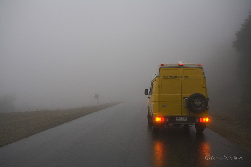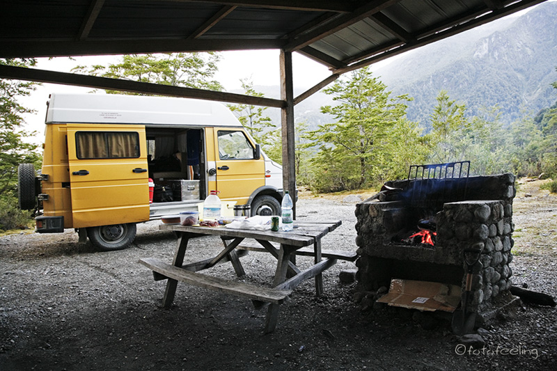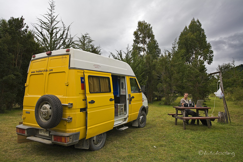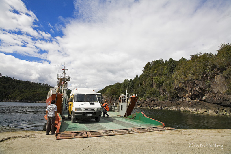 Um 6.00 Uhr früh klingelte der Wecker. Vorsichtig horchten wir auf Regengeräusche, aber es war still. So schauten wir noch etwas müde aus unserem „Bully“ heraus auf die Bergkulisse des Lago Todos Los Santos. Sehr schnell standen wir auf, kochten einen Kaffee und gingen mit unseren dampfenden Bechern an den Strand, der menschenleer im ersten Dämmerlicht vor uns lag. Wir waren hin und weg. Die blaue Stunde und auch die Dämmerung waren einfach traumhaft, gerade wegen der sich drohend zusammenballenden Wolken. Später schimmerte noch etwas Rot hindurch. Dieser Morgen war mit einer der schönsten auf unserer Reise und blieb mir die ganze Zeit in bester Erinnerung. Nach einem leckeren Frühstück rissen wir uns um 9.00 Uhr von dieser Wahnsinnskulisse los und fuhren durch leichten Regen nach Puerto Montt, wo wir ja einen Termin in der Pirelliwerkstatt hatten. Witzigerweise fanden wir die Werkstatt fast auf Anhieb, aber ohne Spanisch war eine Verständigung nicht möglich. Chris rief daraufhin bei Sebastian von Trekker Chile an und er regelte es für uns. Dann war alles kein Problem und wir bekamen zwei neue Reifen, denn unser zweiter Reservereifen hatte auch schon bessere Zeiten gesehen. Es stellte sich bei unserem geplatzten Reifen noch heraus, dass das Ventil defekt war und wir anscheinend dadurch einen Schleichplatten hatten, der zum Zerreißen des Reifens führte. Trekker Chile übernahm daraufhin die Bezahlung beider Reifen. Auch war an unserem „Bully“ nach kurzer Zeit auf dem Display im Innenraum eine Lampe angegangen, die uns etwas Sorgen machte. Sebastian schaute zwar nach, aber so richtig sicher war er sich anfangs auch nicht, was diese Warnlampe zu bedeuten hatte. Da wir beim Hineinfahren in die Stadt einen Ivecohändler gesehen hatten, fuhren wir noch einmal dorthin und wollten diesen Fehler nachschauen lassen. Leider hatten die Leute dort überhaupt keine Lust, uns zu helfen. Sebastian schaute noch mal nach und wir entschieden dann, dass der Fehler noch bis zum TÜV und Ölwechsel in Punta Arenas warten konnte. Denn wir vermuteten richtig, dass sie den Kühlwasserstand anzeigen sollte und kaputt war. Beim Einkaufen in Puerto Montt kaufte Chris gleich noch ein Handy. Jetzt war auch die Kommunikation mit Sebastian gesichert. Nachdem wir auch unsere Vorräte aufgefüllt hatten, konnten wir mittags endlich weiter in Richtung Carretera Austral fahren. Von dieser Straße, die durch dichten Regenwald führt, hatten wir schon so viel gehört und gelesen, dass wir uns mehr als neugierig auf den Weg machten. Irgendwie verpassten wir auf Grund der hypertollen Ausschilderung den richtigen Weg aus Puerto Montt und irrten eine Zeitlang durch die Randgebiete der Stadt. Ein Taxifahrer half uns zum Glück weiter und so kamen wir etwas umständlich wieder auf den „rechten Weg“. Zügig fuhren wir durch die spektakuläre Landschaft, denn wir wollten an diesem Tag unbedingt noch die Fähre von Caleta La Arena nach Caleta Puelche bekommen, da wir ja für den nächsten Tag schon die lange Fähre reserviert und bezahlt hatten. Die Sonne ließ sich auch immer mehr blicken und so kamen wir um 15.20 Uhr in La Arena an. Witzigerweise war auch die Fähre gerade da und so konnten wir sofort hinauffahren. Das war vielleicht ein Glück. Bezahlt haben wir dann direkt auf der Fähre. Sie fuhr eine halbe Stunde an der Küste entlang. Während dieser Zeit ließen wir uns unser Brathähnchen schmecken, welches wir uns noch in Puerto Montt gekauft hatten und genossen die 30 Minuten sonnige Fahrt auf der Meerenge Estuario de Reloncavi. Danach führte uns die Straße noch ein Stück am Meer entlang und dann durch dichten Wald nach Hornopirén, wo wir um ca. 17.00 Uhr ankamen. Hier schauten wir uns erst einmal im Ort um und entdeckten auch gleich den Fährhafen und das Buchungsgebäude, das leider schon geschlossen hatte (Öffnungszeiten: 10.00 - 16.30 Uhr). Der Ort war klein und übersichtlich und er strahlte auf uns die Ruhe und Gelassenheit eines kleinen Fischerortes aus, in dem man sich gleich wohl fühlen kann. Nach einigem Suchen entdeckten wir auch den Campingplatz „Agua de Azul“, der sehr liebevoll am Ortsrand in Richtung Nationalpark angelegt wurde. Hier beschlossen wir zu bleiben. Der Platz verfügte über Strom, warme Duschen und Rasenstellplätze und gefiel uns auf Anhieb. Da die Wolken wieder dichter wurden, fuhren wir nicht mehr in den Park Hornopirén, sondern gönnten uns eine Pause und verbrachten einen ruhigen Feriennachmittag auf dem Campingplatz. Das Wetter meinte es auch gut mit uns und so konnten wir den Abend noch im Freien genießen und dank der Stromversorgung unsere Bilder auf den Laptop laden und auf eine Festplatte sichern. Tageskilometer: Lago Todos los Santos - Hornopieren 223 km inklusive Fährfahrt (8 km) Übernachtung: Agua de Azul, Hornopieren (7000 Peso) - Chile Fähre Caleta La Arena – Caleta Puelche (12 000 Peso für Camper + 2 Personen) |