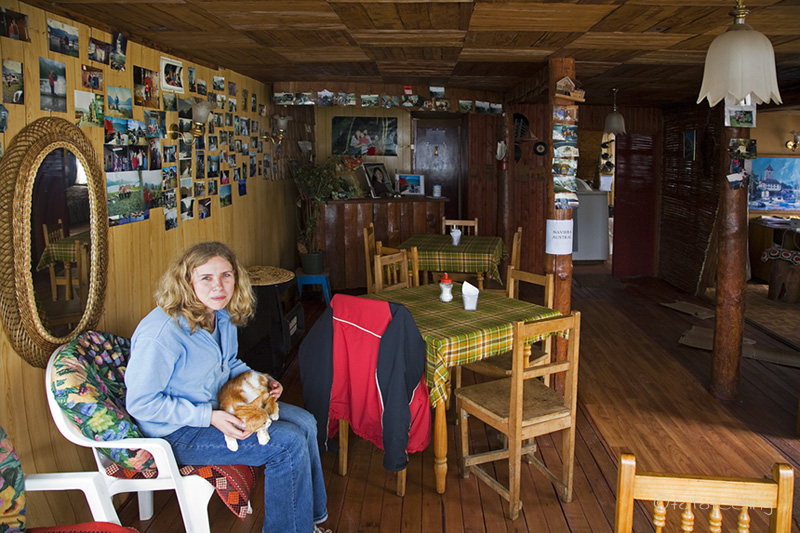 An diesem Morgen wurden wir durch das sanfte Tröpfeln des Regens geweckt. So beschlossen wir spontan, noch etwas länger zu schlafen. Nach dem Frühstück unternahmen wir einen kurzen „feuchten“ Ausflug zum Park Hornopirén, den wir aber auf Grund der aufgeweichten Straße nicht befahren konnten. Wir brachen diese Tour kurz vor dem Parkeingang ab, denn durch den Regen war es auch ziemlich kalt und wir hatten keine Lust, uns im Schlamm noch nasse Füße zu holen. Faszinierend waren jedoch die vielen Flechten an den Häusern, Zäunen und Toren, die der Landschaft ein märchenhaftes Gesicht verliehen. Man erwartete fast, dass hinter dem nächsten Baum eine kleine Elfe hervorschaute und sich die Regentropfen aus den Flügeln schüttelte. ![]() Danach streiften wir etwas durch den Ort und fuhren dann langsam zum Hafen, da Chris am Vortag erfahren hatte, dass die Fähre um 15.00 Uhr ablegt. Er schaute gleich mal in das Buchungsbüro, um die Tickets zu holen, aber es gab leider keine Buchung für uns. Da war wohl etwas schief gegangen. Glücklicherweise war die Fähre nicht ausgebucht und Chris konnte zwei neue Tickets kaufen. So mussten wir noch einmal bezahlen. Chris kümmerte sich um alles und während dieser Zeit schmuste ich mit einer super süßen Katze in dem Büro, das auch gleich noch Restaurant und Wohnzimmer war. Die Zeit am Hafen verging wie im Fluge, denn es gab viel zu sehen. Angefangen von Schiffen, Booten und netten Häusern bis hin zu vielen Hunden und auch Katzen, die durch die Gegend streiften. Chris kaufte unsere ersten sehr leckeren Empanadas mit Meeresfrüchten und Käse, die super schmeckten und dann kam auch schon die Fähre in Sicht. Nachdem Chris rückwärts auf die Fähre gefahren war und auch alle anderen Autos verstaut waren, ging es los. Mittlerweile schien die Sonne pausenlos und die dicken Regenwolken hüllten sich um die Berge. Eine landschaftlich sehr schöne Fährfahrt entlang der Küste brachte uns über den Canal Comau und den Fiordo Renihue nach Caleta Gonzalo. Die meiste Zeit standen wir oben an der Fähre und genossen die Fahrt. Wir sahen Delphine, viele Wasservögel und sogar Lummen. Es war jedoch sehr windig und dementsprechend kalt, so dass wir bald unsere Regenjacken, Mützen und Handschuhe anhatten. Die Wellen waren beeindruckend hoch und es rollten immer wieder Gischtwellen über unser Auto hinweg. Zum Glück wurde ich nicht seekrank und es machte uns unheimlich viel Spaß. Um ca. 20.45 Uhr mit dem letzten Licht des Tages kamen wir in Caleta Gonzalo an und wollten gemütlich zu dem Campingplatz kurz hinter dem Ort fahren. Aber Pech gehabt, den Campingplatz gab es zwar, aber er war nur etwas für Rucksackreisende. Um auf die Campsite zu gelangen, musste man eine ca. 100 m lange Hängebrücke zu Fuß überqueren. Das ging natürlich nicht mit unserem „Bully“. Mittlerweile war es leider auch schon dunkel und es blieb uns nichts anderes übrig, als weiter zu fahren und nach einem anderen Campingplatz Ausschau zu halten. Zum Glück hatten wir gutes Kartenmaterial und auch einen Campingführer für Chile vom Autovermieter mitbekommen und darin sahen wir, dass es im Park Pumalin noch einige weitere Campingplätze gibt. Im Nachhinein hätten wir uns eigentlich auch auf den Parkplatz vor dem ersten Campingplatz stellen können, aber dort standen „Zelten verboten“-Schilder und wir waren so brav, uns daran zu halten. So fuhren wir durch die Dunkelheit auf der Suche nach einem Campingplatz. Ca. 22.00 Uhr entdeckten wir den Campingplatz Lago Negro und stellten uns ganz alleine auf die Campsite an der Straße. Wir waren jedoch so müde, dass wir keine Bedenken aufkommen ließen und schon bald tief und fest schliefen. Tageskilometer: Hornopirén - Lago Negro, Pumalin Park 137 km inklusive Fährfahrt Übernachtung: Pumalin Park am Lago Negro (kostenlos) - Chile Fähre Hornopirén - Caleta Gonzalo: 59600 Peso |