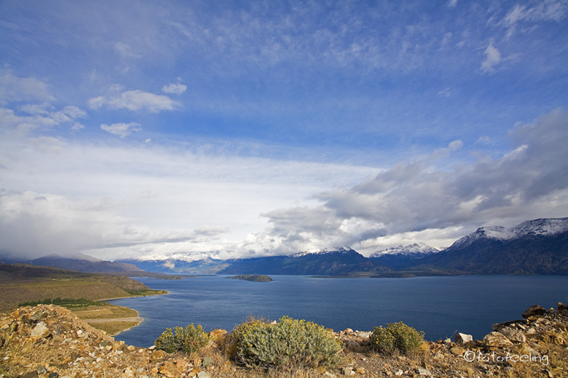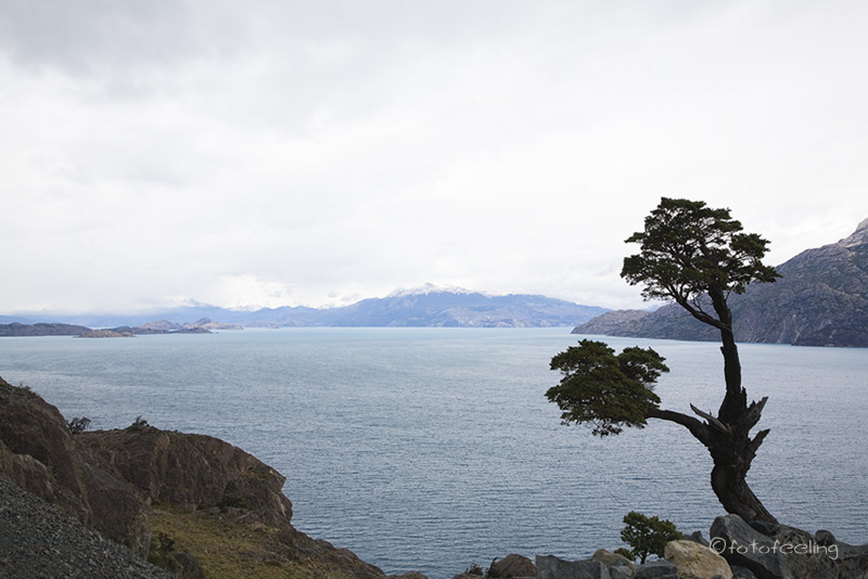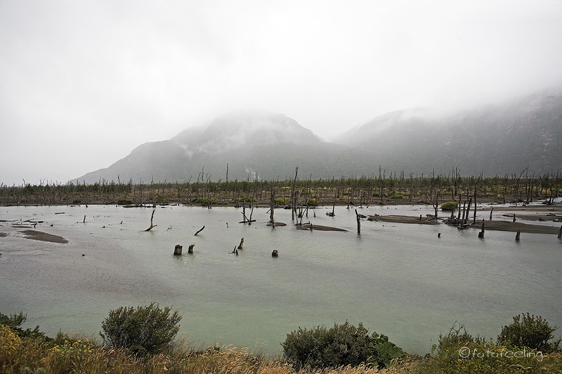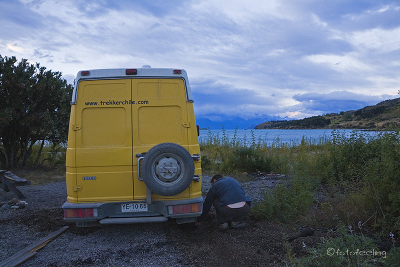Das Wetter besserte sich über Nacht nicht und so brachen wir bei starker Bewölkung und leichtem Regen auf. Leider sahen wir auch die Laguna Verde nur im Regen und konnten die grüne Farbe eher erahnen, als dass wir sie sahen. Auch der Bosque Muerto mit seinen abgestorbenen Bäumen lag wunderschön im Wasser vor uns, aber es regnete und war grau in grau. An einem kleinen See konnten wir dann etwas blauen Himmel entdecken und die Hoffnung stieg, dass der Tag doch noch ohne Regen enden könnte. Die Landschaft war trotzdem eindrucksvoll, aber natürlich wäre sie mit Sonnenschein noch viel schöner gewesen. Dann erreichten wir den Lago General Carrera, der mit seinen 2240 qkm der größte See Chiles ist. Er liegt an der argentinischen Grenze und wird in Argentinien zum Lago Buenos Aires. Auch landschaftlich unterscheidet sich der chilenische vom argentinischen Teil. In Chile umgeben den See die hohen Gipfel der südlichen Anden, während im Osten (Argentinien) die Landschaft fast eben ins patagonische Flachland eingebettet ist. In Puerto Tranquilo regnete es wieder stark und so beschlossen wir, erst einmal ins Internetcafe zu gehen. Wir freuten uns riesig über die Neuigkeiten unserer Freunde in Deutschland und berichteten von unseren Erlebnissen. Die Leitung war zwar zum Verzweifeln langsam, aber draußen regnete es ja eh. Als wir eine Stunde später das Restaurant verließen, klarte es gerade etwas auf und der Regen hatte gänzlich aufgehört. Kurz hinter Puerto Tranquilo kann man links zum See hinunter fahren und eine Bootsfahrt zu der bekannten „Marmorkapelle“ machen. Das ist eine Höhle aus weißem Marmor nahe am Ufer des Lago, die man nur mit einem Boot besichtigen kann. Wir fuhren zwar die extrem steile Straße zur Bootsanlegestelle hinunter, aber wir wussten nicht, ob wir sie auch wieder hinauf schaffen würden. Das war die erste Belastungsprobe für unser Auto. Da das Wetter zu schlecht war, verzichteten wir auf die Fahrt und Chris fuhr unser Auto wieder den Berg hinauf. Zum Glück schaffte „Bully“ den Weg ohne Probleme und kletterte brav die Serpentinen hinauf. Oben angekommen, hätten wir am liebsten einen Freudentanz gemacht, denn es war wirklich eine unglaublich steile Piste, die schon manches Auto nur mit Hilfe geschafft hatte. Da das Wetter auf der Weiterfahrt entlang des Sees immer besser wurde, entschlossen wir uns zu einem Ausflug nach Cochrane. Die Piste war zwar übles Wellblech, aber die Landschaft entschädigte uns dafür. Wir fuhren am Lago Bertrand vorbei und folgten dem Flusslauf des Rio Baker, der sich malerisch durch die Berge und Schluchten wand. In Cochrane tankten wir wieder auf und sahen eine breite Regenfront immer näher kommen. Kurz entschlossen machten wir uns auf den Rückweg und fuhren dem Regen voraus wieder durch die wunderschöne Berglandschaft. Zurück am Lago General Carrera leuchteten die Berge auf der gegenüber liegenden Seeseite in den schönsten Farben der untergehenden Sonne. Nun hieß es einen Fotoplatz zu finden und dieses Schauspiel festzuhalten. Nach einiger Suche fanden wir auch einen schönen Platz. Die Farben waren zwar nicht mehr ganz so intensiv, aber es war immer noch beeindruckend schön. Danach war es an der Zeit, eine Campsite zu suchen. Leider war in unserem Campingführer auf dieser Seeseite nur eine kostenlose Campsite ohne Komfort am Ortsrand von Puerto Guadal aufgeführt. Wir fuhren noch etwas weiter in Richtung Chile Chico, doch wir fanden nichts, wo wir uns hinstellen konnten. Also wendeten wir und schauten uns die heruntergekommene Campsite mal aus der Nähe an. Mit Ach und Krach kamen wir mit unserem „Bully“ durch das Eingangstor und fuhren zu einer geeigneten Übernachtungsstelle etwas weiter in Richtung Strand. Es sah eigentlich ganz nett dort aus. So wollte Chris noch etwas rangieren und uns in eine schöne Position mit Seeblick bringen, aber es ging nichts mehr. „Bully“ war im weichen Kies auf einer Seite mit dem Hinterreifen eingesunken. Dank Afrika bekamen wir keine Panik und machten uns ans Schaufeln. Chris fand noch ein paar Bretter, die man unter die Reifen legen konnte und nach einiger Arbeit bekamen wir unser Auto frei, aber nur, um einen Meter zurück wieder im Kies zu versinken. Diesmal waren wir richtig weg. Chris schaufelte fast einen Meter tief und auch mit Brettern war ein Freikommen unmöglich. Mittlerweile war es dunkel und wir langsam am Verzweifeln. Da ging Chris los in Richtung Dorf und wollte Hilfe holen. Mit viel Glück und dem richtigen spanischen Wort für großen Wagenheber (La Gata) machte er sich auf den Weg, während ich am Auto blieb und noch etwas weiter schaufelte. Es dauerte einige Zeit, da beleuchteten Scheinwerfer die Campsite. Chris hatte nach mehreren erfolglosen Versuchen tatsächlich jemanden gefunden, der uns helfen wollte. Als der Chilene dann unser „klitzekleines“ Auto und das Problem sah, war er doch etwas ratlos und fuhr wieder weg. Per Handzeichen signalisierte er uns, dass er Hilfe holen würde. Er kam wirklich wieder und brachte einen jungen Mann mit, der gleich alles in die Hand nahm. Mit weiterem Buddeln und Ziehen durch den 4x4 bekamen wir unser Auto endlich wieder frei. Aber auch die Freude währte nicht lange, denn beim Wendeversuch steckte „Bully“ wieder im weichen Kies fest. Es war fast wie in einer Endlosschleife. Wieder hieß es buddeln, Latten unterlegen und dann endlich mit Hilfe des Suzuki stand unser Auto irgendwann vor dem Campeingang. Der Alptraum war endlich vorbei! Chris spendierte noch eine Runde Bier an die fleissigen Helfer und gab dem jungen Burschen noch ein Trinkgeld, das er nur widerwillig annahm. Wir waren endlos erleichtert, aber einen Platz zum Schlafen hatten wir immer noch nicht. Hinzu kam, dass Chris mehr als schmutzig war und eigentlich eine Dusche gebraucht hätte. Da es aber schon 22.45 Uhr war, lohnte eine weitere Campingplatzsuche nicht wirklich. Wir fuhren etwas weiter und stellten uns einfach in die Einfahrt der L