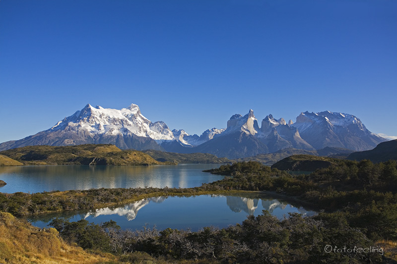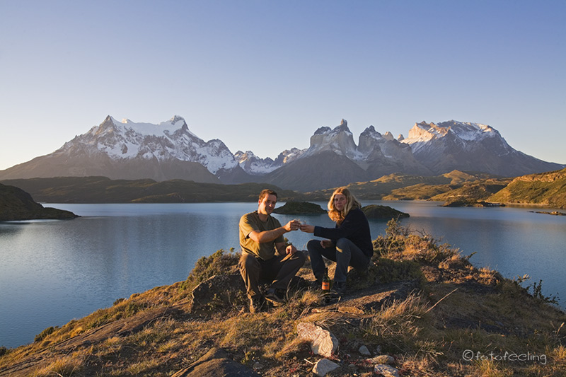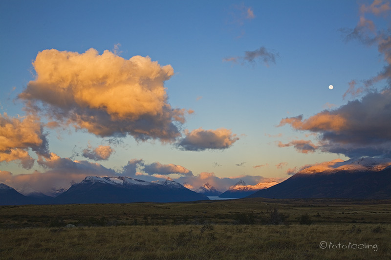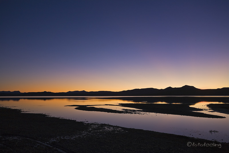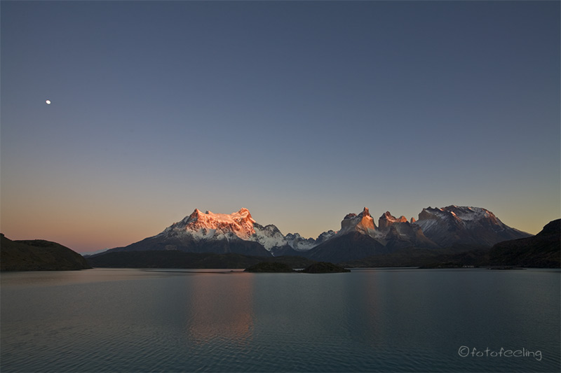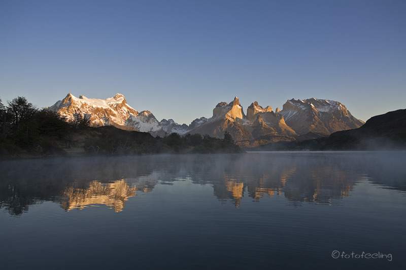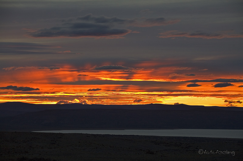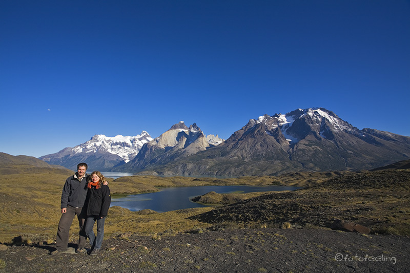 Zum Glück hatten wir zum Schlafen die Decken auf unsere Schlafsäcke gelegt, denn in der Nacht kühlte es auf -4 °C ab. Auch im Auto hatten wir gerade mal 3 °C und wir fröstelten ganz schön beim Aufstehen. Wir kochten uns einen heißen Kaffee, den wir in unseren Thermobechern mit auf den Hügel nahmen und genossen dort eine wunderschöne, farbenfrohe Dämmerung bei einem sternenklaren Himmel ohne Wolken. Nur der Mond schien über den Gipfeln der Berge und die Gräser glitzerten vom Frost der Nacht. Mit dicken Jacken, Mütze und Handschuhen ging es gerade so, aber die Finger waren leicht taub vor Kälte, da tat ein wärmender Schluck Kaffee so richtig gut. Später leuchtete dann die Sonne die Berge an und tauchte sie in ein wunderschönes warmes Licht. Die Berge spiegelten sich im bewegten Wasser des Sees. Nach dem Frühstück erkundeten wir weiter den Park und fanden immer wieder tolle Fotomotive. So verbrachten wir einige Zeit am Rio Paine und fotografierten einen Teil des Paine-Massivs, das sich im ruhigen Wasser spiegelte. Dann wollten wir zum Lago Gray. Als wir an der Brücke „Puente Webel“ ankamen, hielt uns die Polizei auf und teilte uns mit, dass in einer Stunde dort die Präsidentin mit einem Hubschrauber landen sollte. Wir quatschten etwas und durften dann doch noch passieren und weiter zum Lago Gray fahren. Dort wanderten wir zum Ufer des Sees und sahen den Gletscher von weitem. Leider war das Licht nicht optimal, aber es war eine schöne Wanderung. Wir konnten auch zwei kleine Eisberge aus der Nähe bewundern und nahmen uns für den nächsten Besuch eine Bootsfahrt vor. An der Hosteria „Lago Gray“ erkundigten wir uns nach den Preisen und mussten erst einmal schlucken. 70 US$ für eine 4-stündige Bootsfahrt erschien uns dann doch etwas viel, aber wir wussten ja nicht, was da so alles geboten wird. Auf den Weg zu unserem Auto sahen wir noch eine Fuchsmutter mit zwei Jungfüchsen und einer von ihnen kam fast auf Streichelnähe zu uns heran. Zum Glück war die Brücke beim Zurückfahren wieder frei und wir konnten ungestört passieren. Am Nachmittag schauten wir uns noch die Laguna Azul an, von der man einen sehr schönen Blick auf die Cuernos des Paine Massivs hat. Die Campsite war sehr nett am Ufer des Sees angelegt, aber es zog uns wieder zu „unserer“ Campsite am Lago Pehoe. Unterwegs hielten wir noch an einem schönen Wasserfall und bewunderten riesige Guanakoherden aus der Nähe. Zurück auf der Campsite schnappten wir uns eine Flasche Rotwein, unsere Gläser und natürlich die Fotoausrüstung und wanderten wieder auf den kleinen Hügel. Dort genossen wir den wolkenfreien Sonnenuntergang und die letzten wärmenden Strahlen, ehe wieder eine eiskalte sternenklare Nacht anbrach. Tageskilometer: Rundfahrt im Torres del Paine NP 158 km Übernachtung: Campsite Pehoe - Chile |